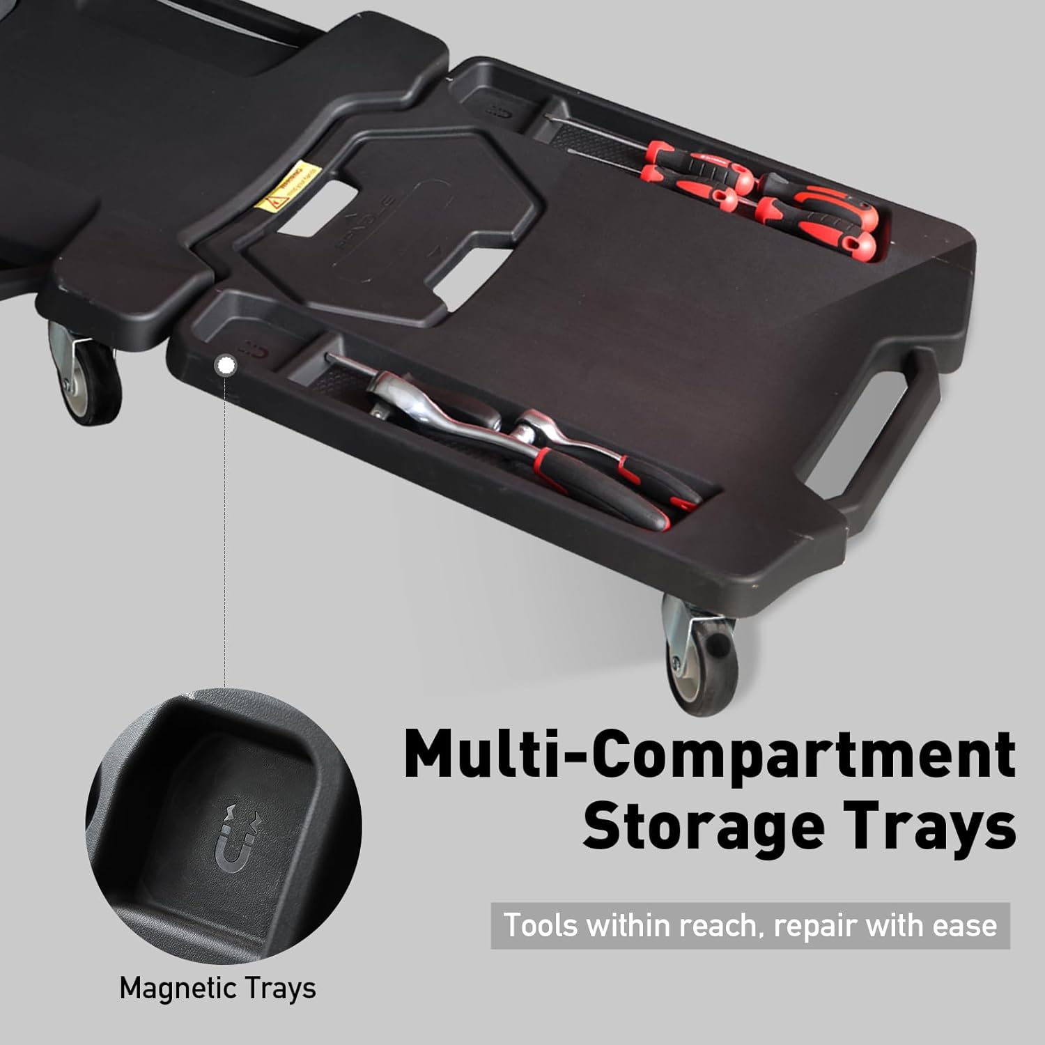 - 【Headrest & Storage Trays】Features a soft, comfortable headrest for extended use. Dual Sides tool trays include 2 magnetic parts trays, securely hold screws, nuts, and wrenches—keeping everything organized.