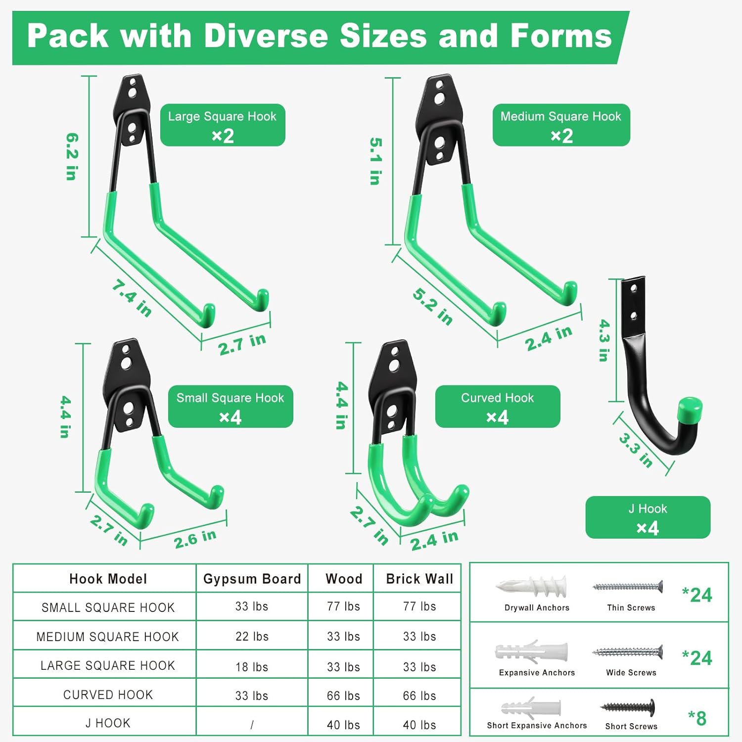 - Versatile Set of 5 Hook Types: This set includes 20 hooks in 5 different shapes and sizes, offering a tailored solution for organizing various items. Specially designed "J" hooks (4 included) are perfect for hanging hoses, extension cords, or heavy-duty tools.