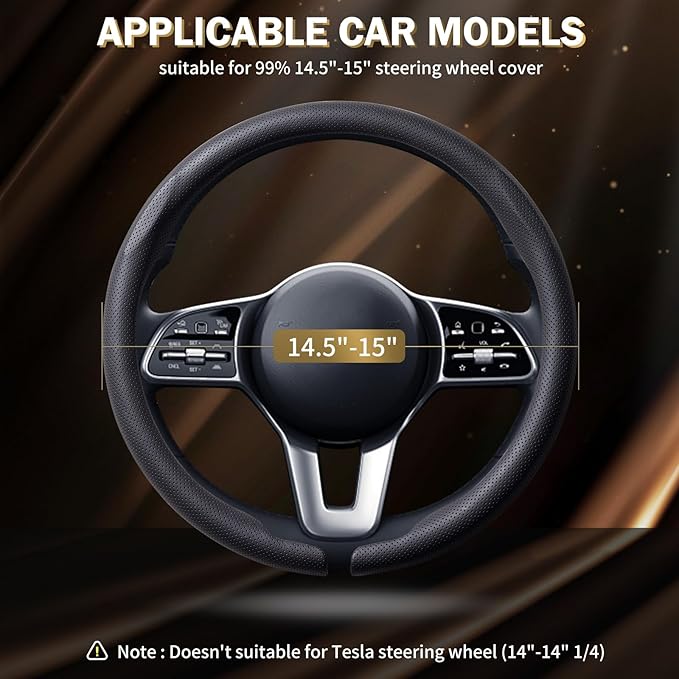 - Compatibility: The open design in bottom makes installation a breeze, typically completed in just 15s. The bottom-open design also greatly enhances the leather steering wheel cover's compatibility and better fit most 14.5" to 15" standard-size steering wheels. It's heat-resistant and cold-resistant, universal for all seasons.
