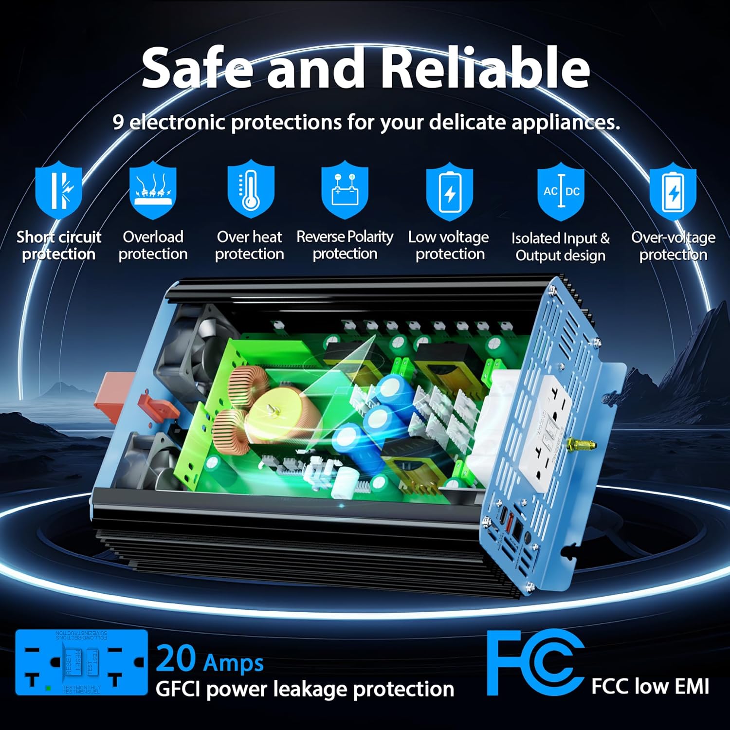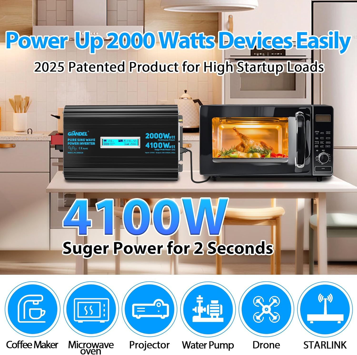 - 【Widely Uses to protect appliances】It is longer than other 2000 Watt inverters for FCC approval,its advanced pure sine wave technology provides quality AC equivalent to grid power which will protect and extend the life of your electronics and appliances, such as 1500Watt microwave, freezer,Laptop,tablet,Audio etc. With its quiet and high inductive loads, the solar inverter operates with no buzzing sounds when your electronics are turned on and allow them to run smoother, cooler, and quieter