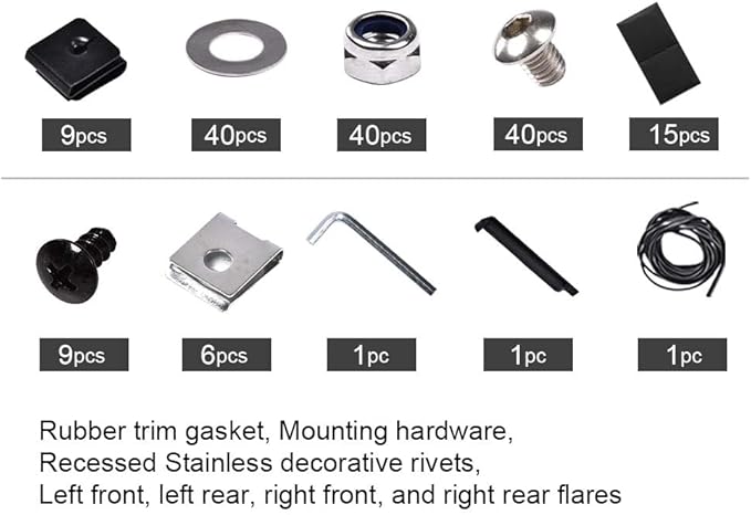 - EASY TO INSTALL: Professional installation is highly recommended. Package Includes: A set of pocket style Fender Flares Necessary mounting hardware.