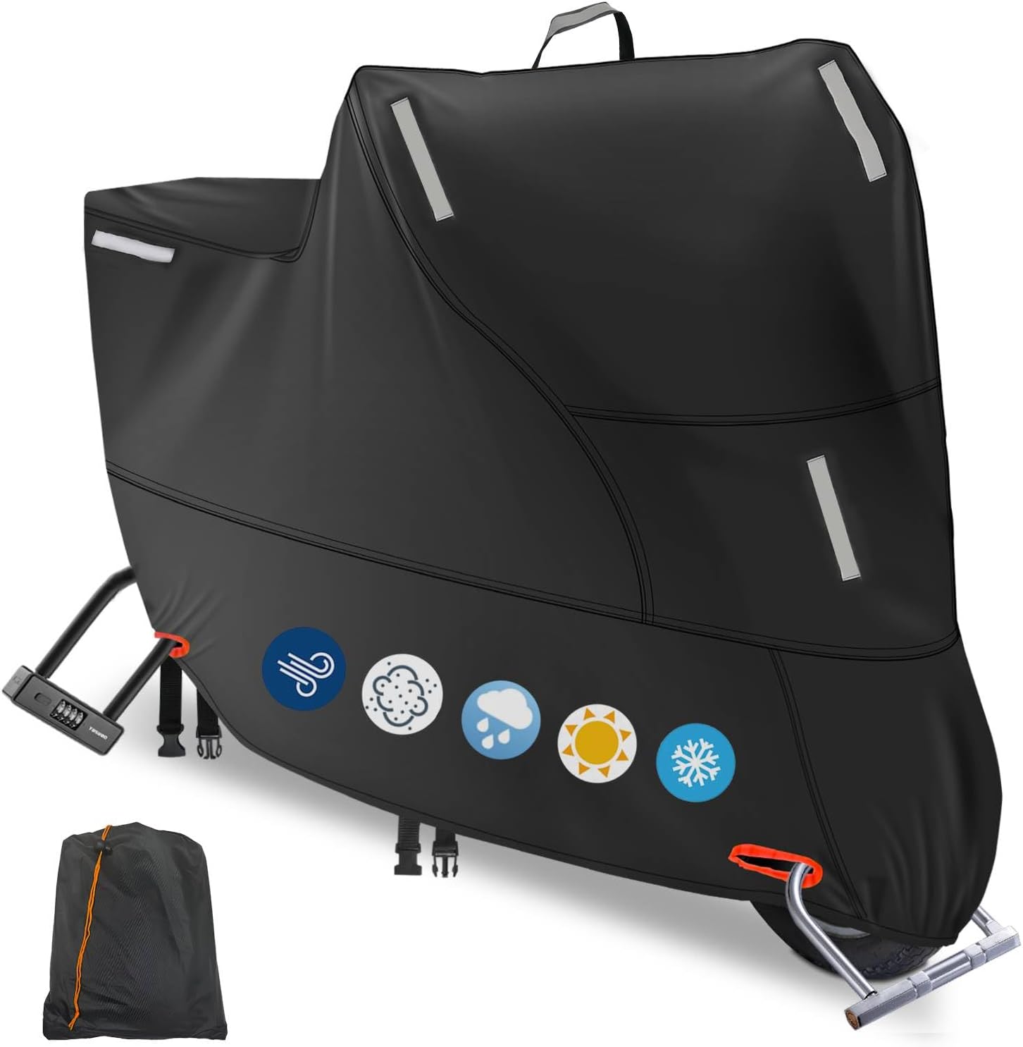 - 6 Reflective Strips Design: The waterproof motorcycle cover with 5 silver reflective strips on front and back, and improve safety at night to prevent collision. There is also 1 silver reflective carrying handle on top, easy to lift up and down, distinguish the sign in front, easy to install. PLEASE NOTE: Please measure the length, width and height of your bike first and reserve the length 4 inches/10 cm on this dimension.