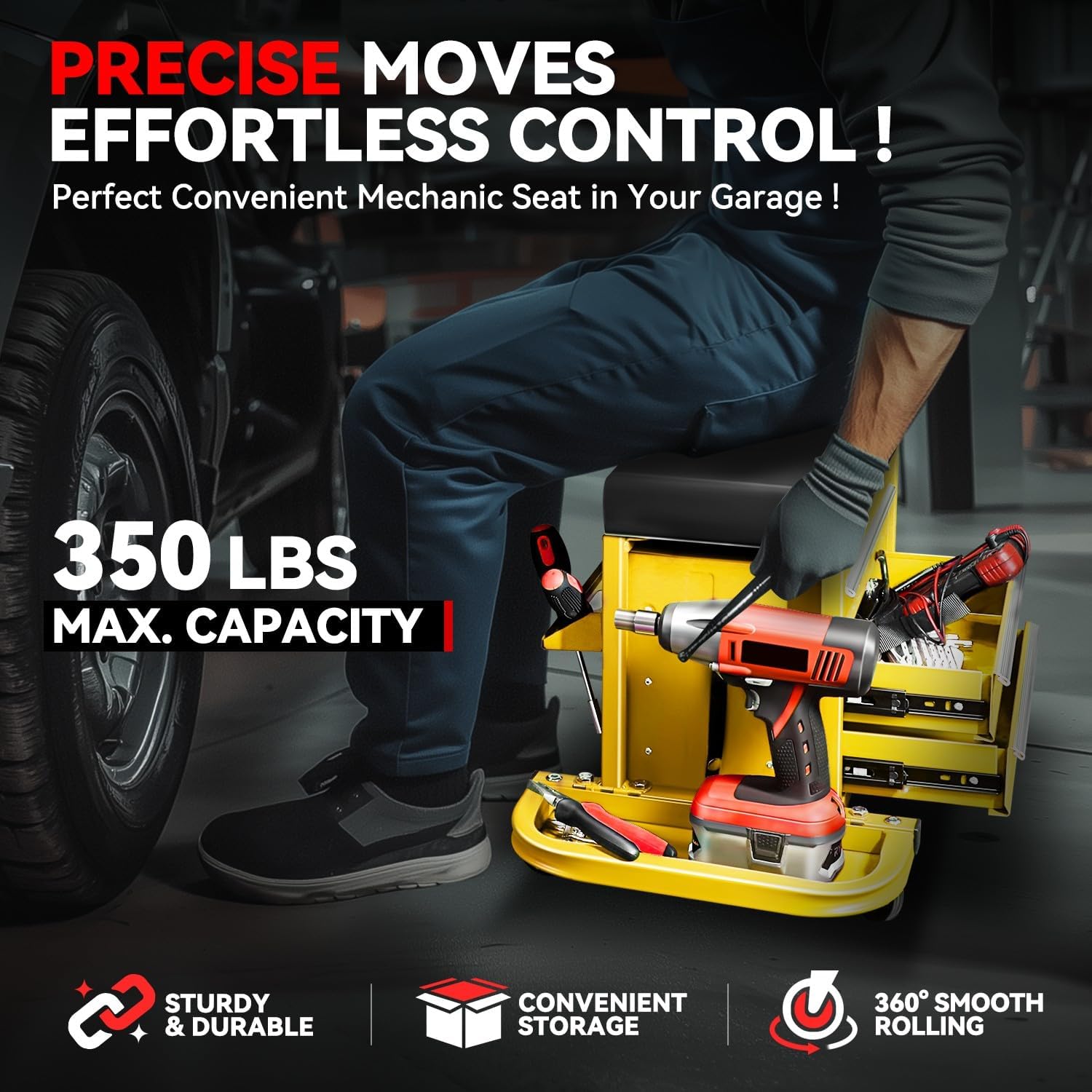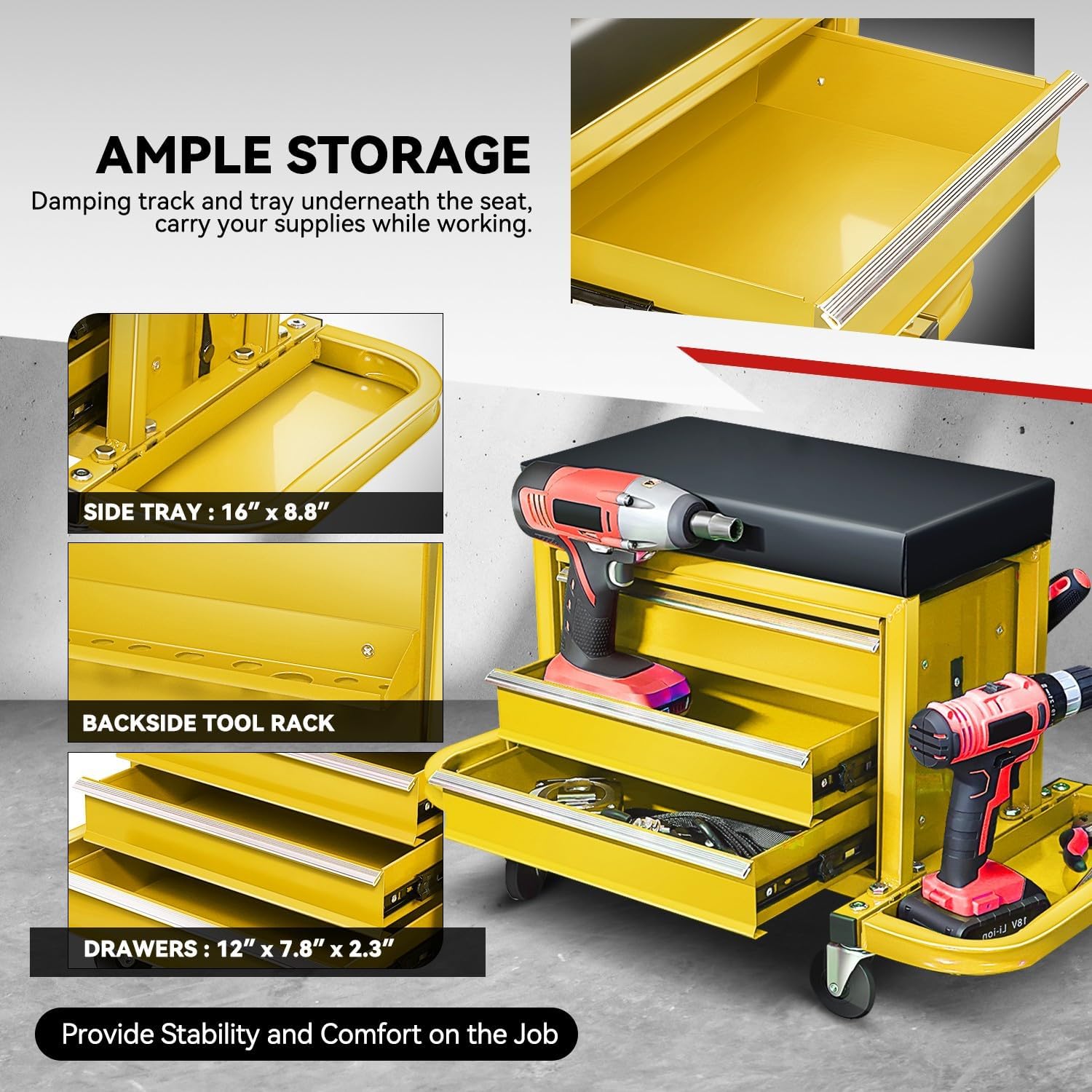 Auto Dynasty 3-Drawer Mechanic Rolling Seat, 350 LBS Capacity Roller Garage Shop Seat with Storage Tool Tray for Workshop, Repair Shop, Warehouse, Yellow