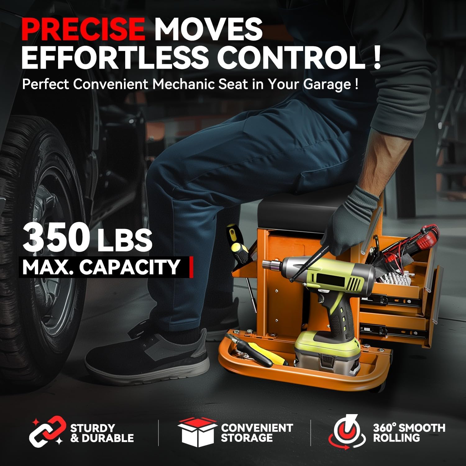 - Convenient Storage: This rolling seat has 3 drawers and 2 fold-down side trays, which offer ample storage for small tools and parts. Keep your car care and repair essentials close at hand, allowing you to work more efficiently.