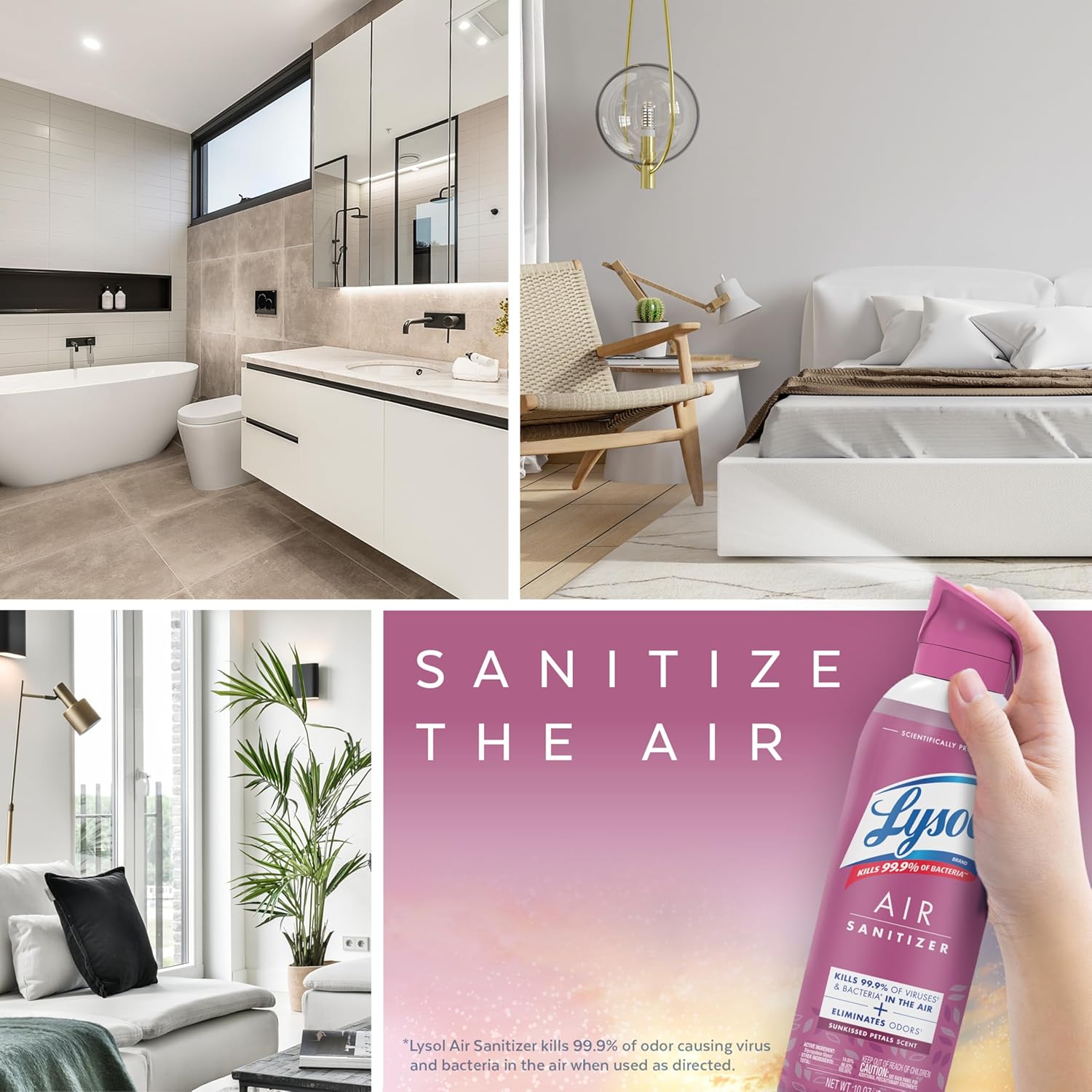 - SANITIZE THE AIR THROUGHOUT YOUR HOME: Lysol Air Sanitizer Spray sanitizes and eliminates 99.9% of odor causing bacteria* in the air. Enjoy the sunkissed petals scent. (*Use as directed).