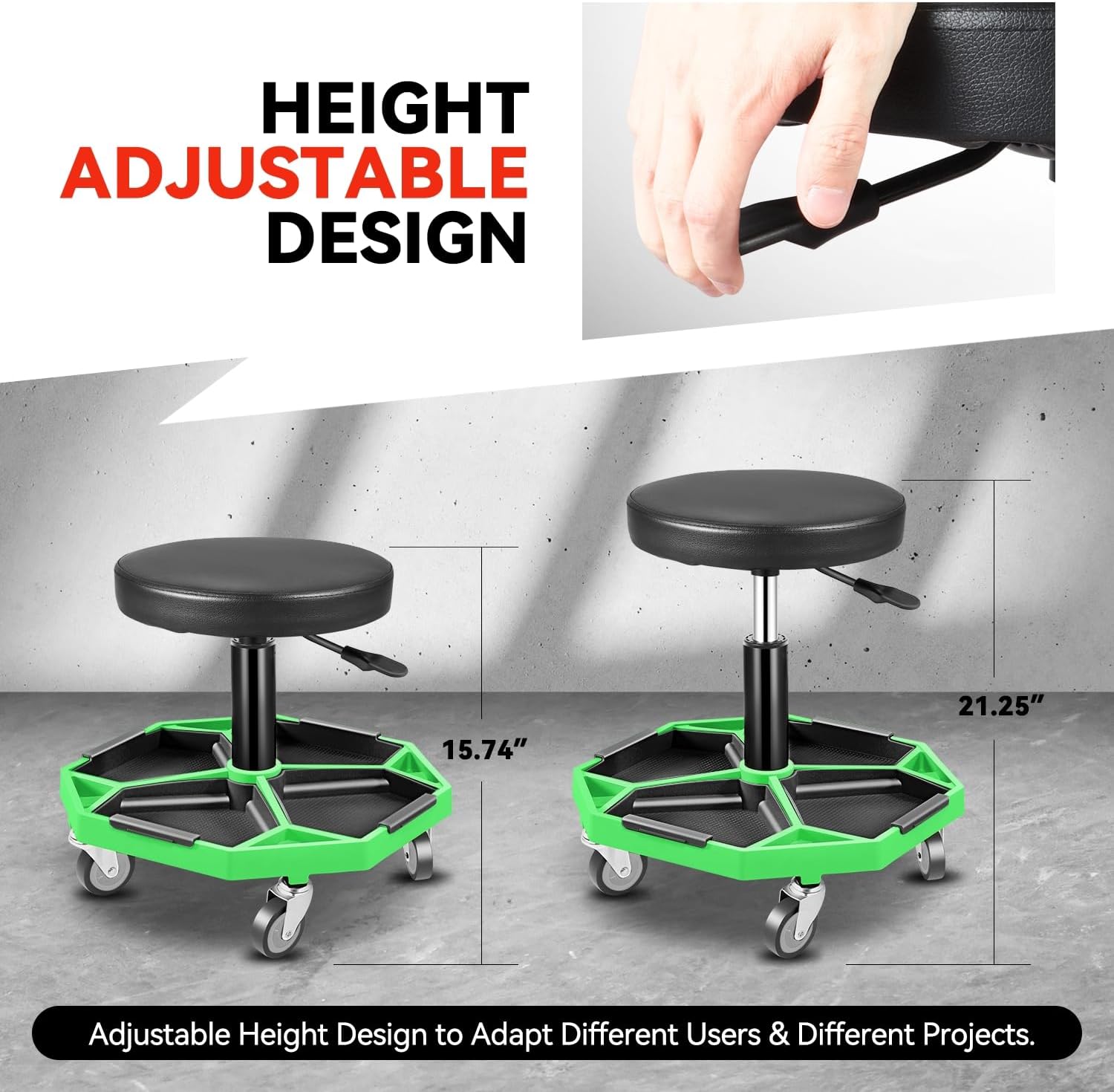 Auto Dynasty Mechanic Stool, Adjustable Rolling Pneumatic Creeper Garage Shop Seat with Tool Tray, 300 LBS Roller Seat for Workshop Auto Repair, Adjustable Height 15.7" to 21", Green
