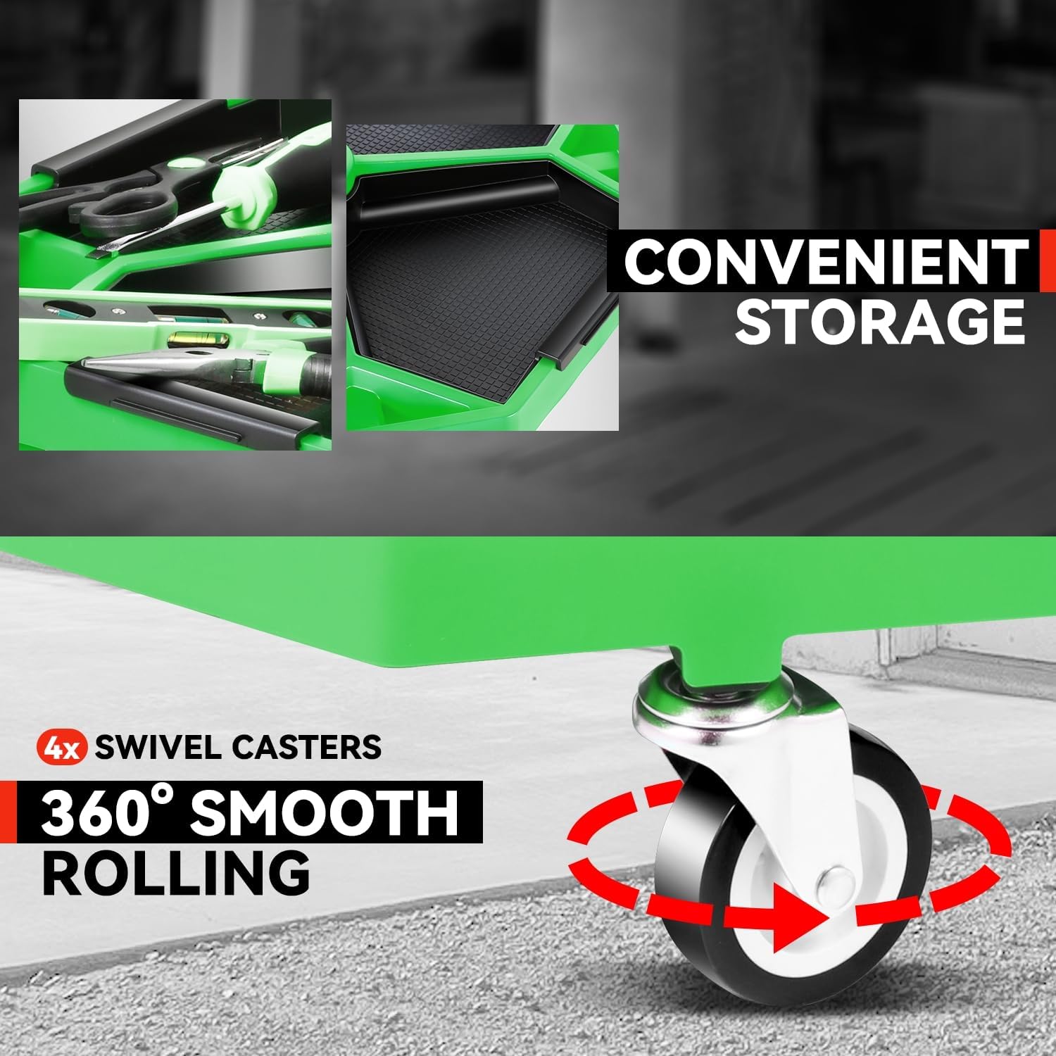 - 【Enhanced Mobility】Equipped with 4 swivel casters, this mechanic stool provides smooth and precise maneuverability around your garage, streamlining your work process.