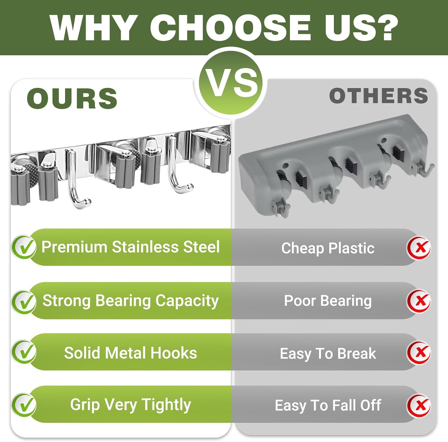 - Versatile Use: Suitable for holding a variety of cleaning tools, including brooms, mops, rakes, shovels, and more, making it a versatile storage solution for your home or garage.