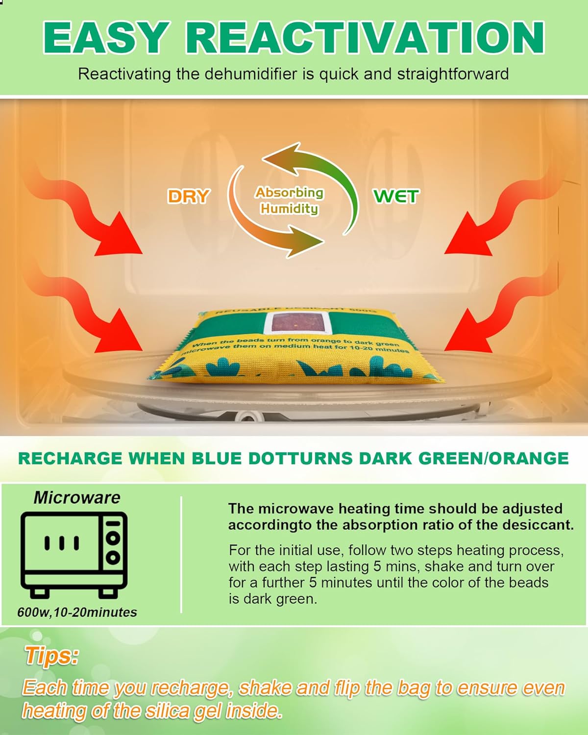 - Fast and Easy Reactivation: Recharging your moisture absorber bags is quick and simple! Just place the bags in the microwave for up to 5 minutes on each side, repeating the process until the beads return to their original orange color. For best results, use low microwave heat (levels 1-3) to ensure safe reactivation and avoid damaging the transparent window. The reactivation time may vary depending on the moisture level and bead condition
