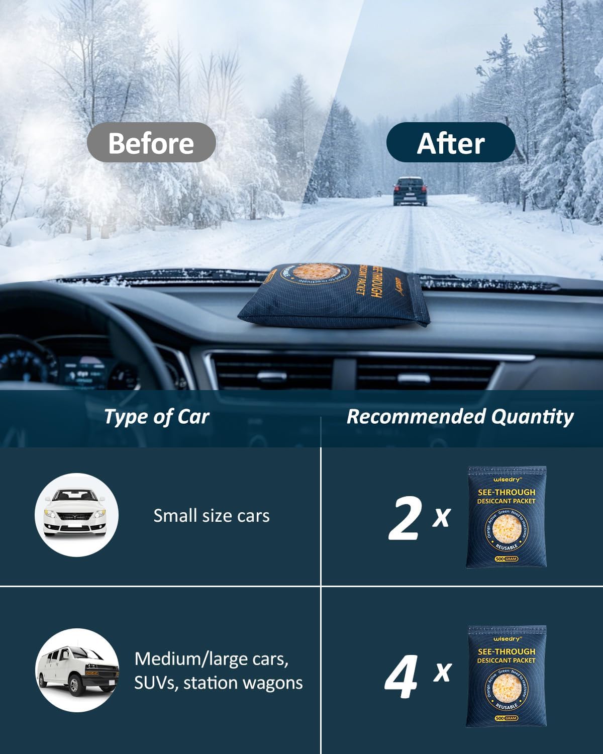 wisedry 4 x 500 Gram See-Through Silica Gel Car Dehumidifier Packets, Color-Indicating Desiccant Packs for Storage, Reusable Safe Dehumidifier, Heat Resistant Dehumidifier Bags