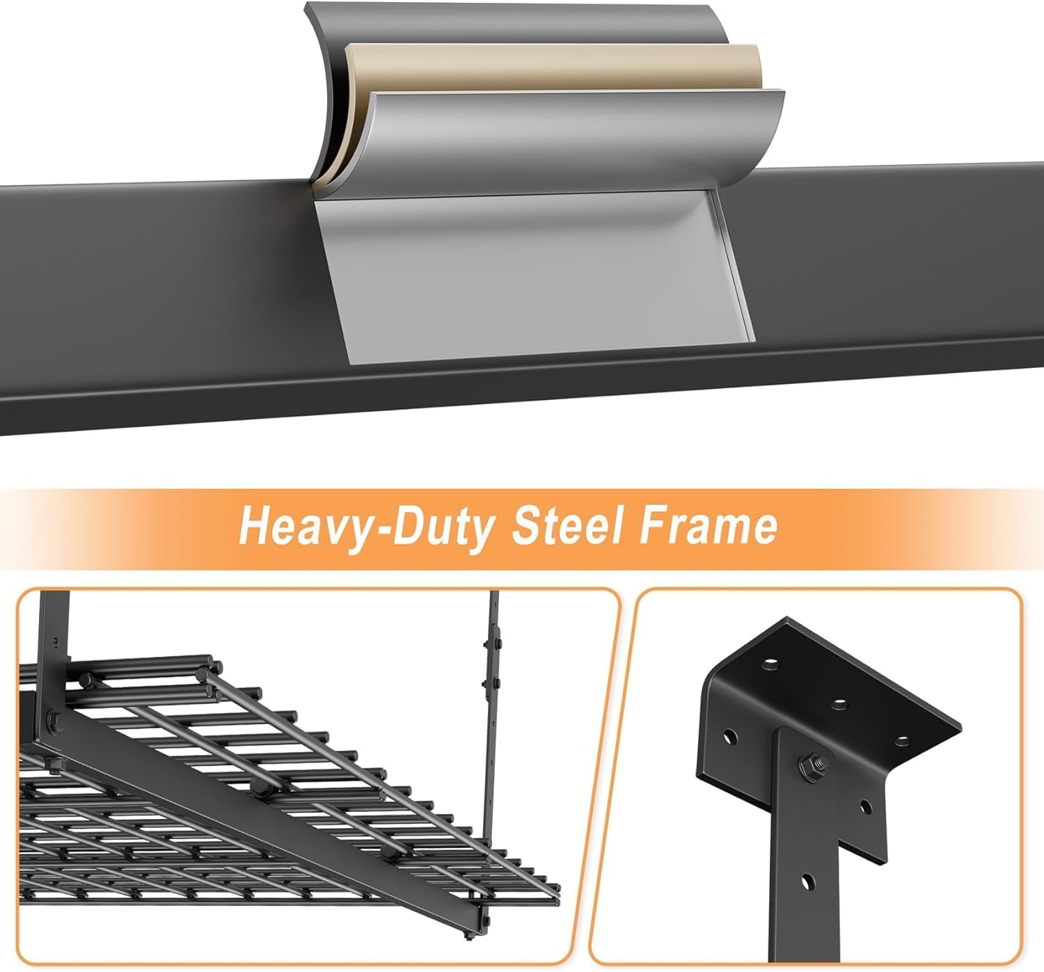 - 🏆【Heavy-Duty 250 lbs Capacity】- Crafted with industrial-grade cold-rolled steel, our garage ceiling storage rack securely holds up to 250 lbs. Perfect for bulky seasonal items, toolboxes and outdoor gear.
