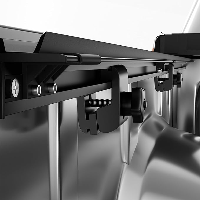 - All-Weather Protection - Engineered with rust-resistant aluminum panels and a black powder-coated frame, this truck tonneau cover is designed to endure harsh conditions. Includes a secure track and rail mounting system with drain tubes, safeguarding your cargo from rain, dust, snow and dirt.