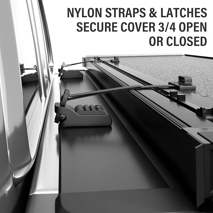 - Secure Auto-Latch Mechanism - The quad-fold design offers quick cargo access, with nylon straps securing the cover in the 2/4 open position while driving. The latch allows for one-finger release to open and locks automatically when you close the cover.