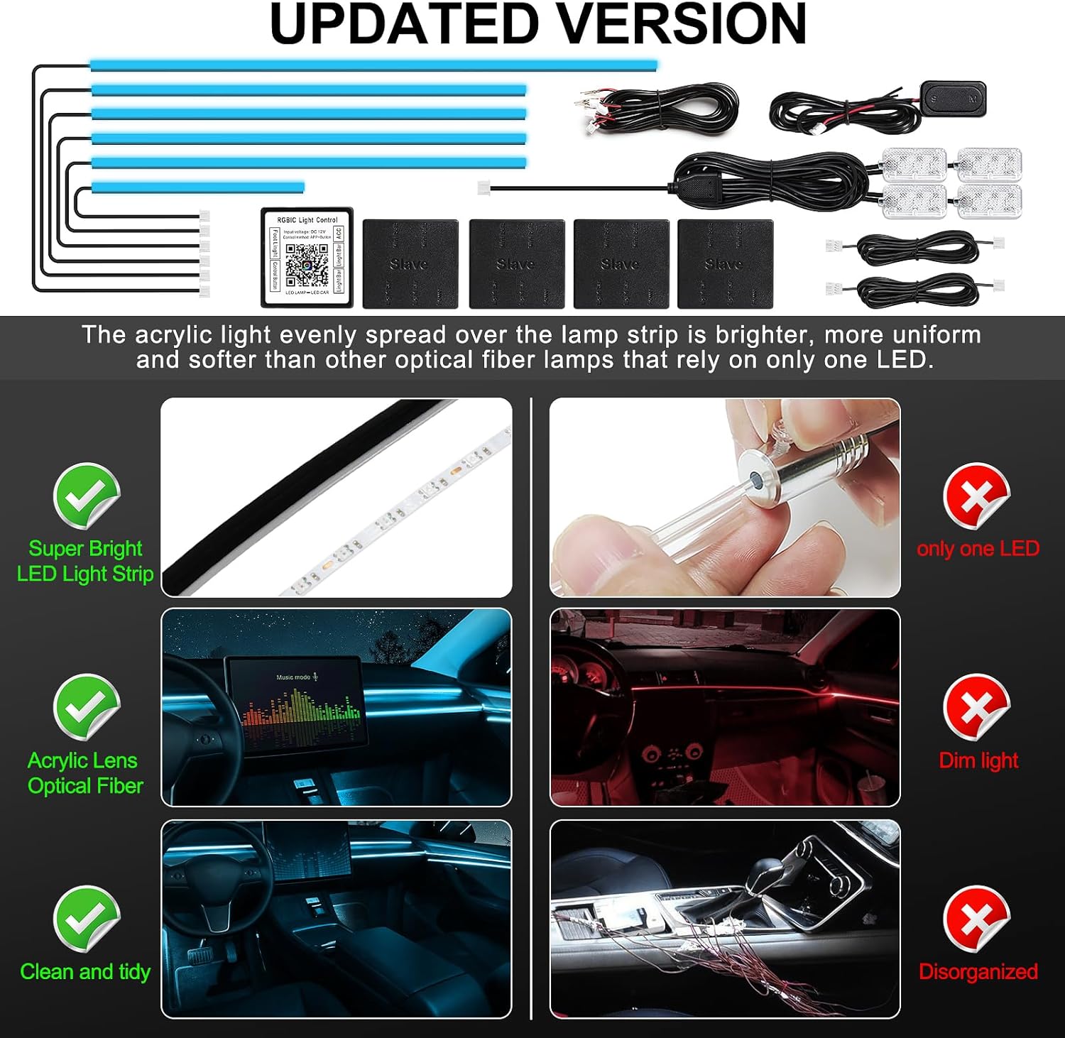 - ăHigh Bright & UniformăThe RGB Acrylic LED Car Ambient Interior Lighting have super bright LED and acrylic lens and contains 6 LED strips (4*29.5inch+1*43.3inch+1*14inch), Foot well lamp*4(44.5inch*2/64.9inch*2), also comes with 1 main controller and 4 sub controllers,and can be flexibly installed on any car by DIY without disorganized, which is plug and play, and this acrylic light evenly spread over the lamp strip is brighter, more uniform and softer than other optical fiber lamps that rely on only one LED.