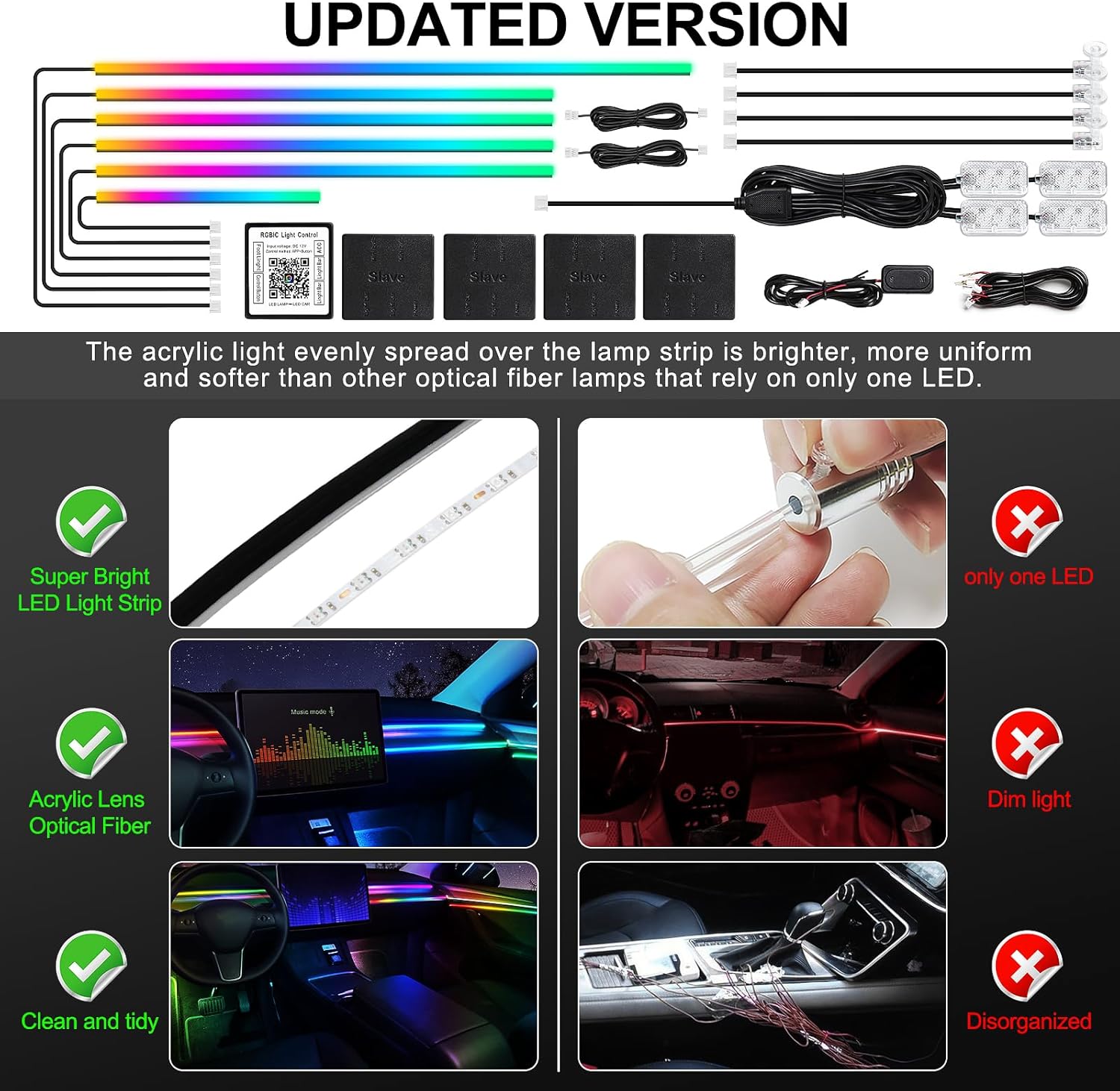 - ăRGB+IC Dream+color 14 in 1 Car Ambient Lighting KităThe RGB Acrylic Interior LED Strips Lighting effect of the upgraded RGB Smart IC built-in color chase mode looks like a regular chase, bouncing, dancing and flashing bar. If you don't want a chase or blinking mode, you can also choose a static color mode in the app. MAODANER also supports voice control mode and more, bringing you more driving fun.