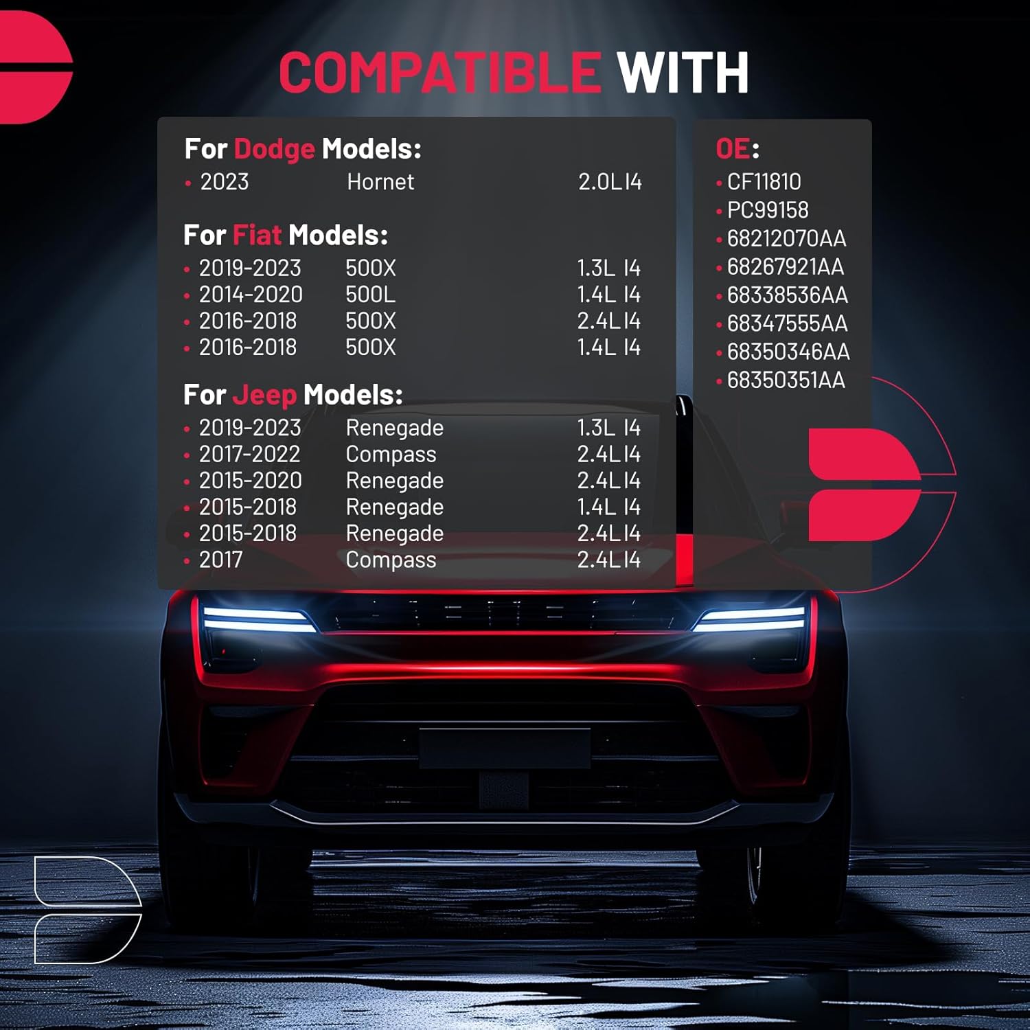 - [Vehicle Fitment] Compatible with Fiat 500X 2019-2023 1.3L l4, 500X 2016-2018 1.4L/2.4L, 500L 2014-2020 1.4L l4; Compatible with Dodge Hornet 2023 2.0L l4; Compatible with Jeep Renegade 2019-2023 1.3L l4, Renegade 2015-2018 1.4L l4, Renegade 2015-2020 2.4L l4, Compass 2017-2022 2.4L l4