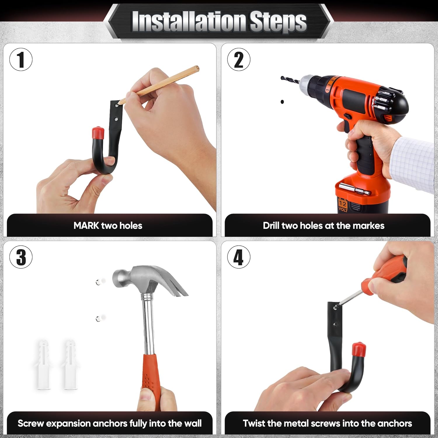 - Effortless Installation: We know many customers struggle with incorrect installation locations or want to move their garage hooks but often find themselves short on screws. That’s why Nacial provides ample screw sets—our 20 pack garage hook includes 2*42 screws. Each garage hook comes with 2 types of screws, and with just a drill or screwdriver, you can effortlessly install them on drywall, wood, concrete, or brick walls. Enjoy quick and easy organization with Nacial!
