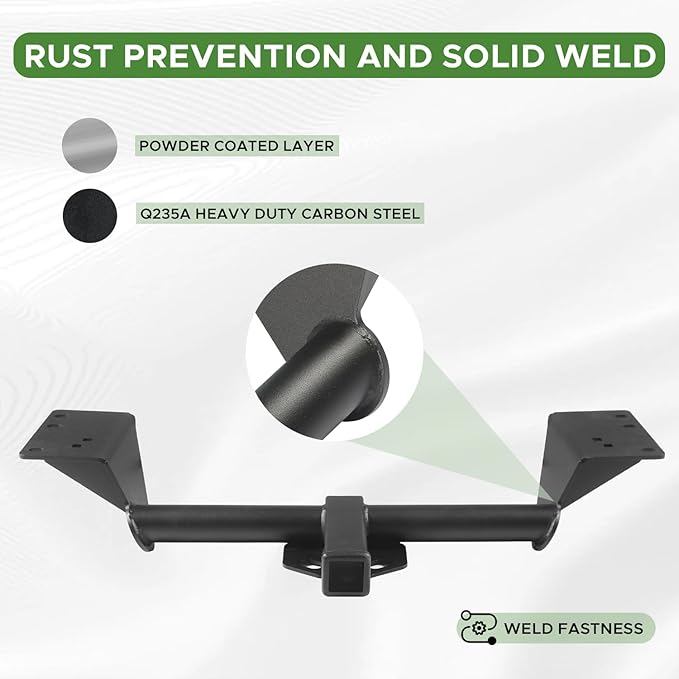 - DURABILITY: This rear trailer hitch receiver features Q235A carbon steel for high strength. The black powder coating on the surface effectively resists rust. Moreover, the welded joint at the mouth is firm, providing safety protection for your journey