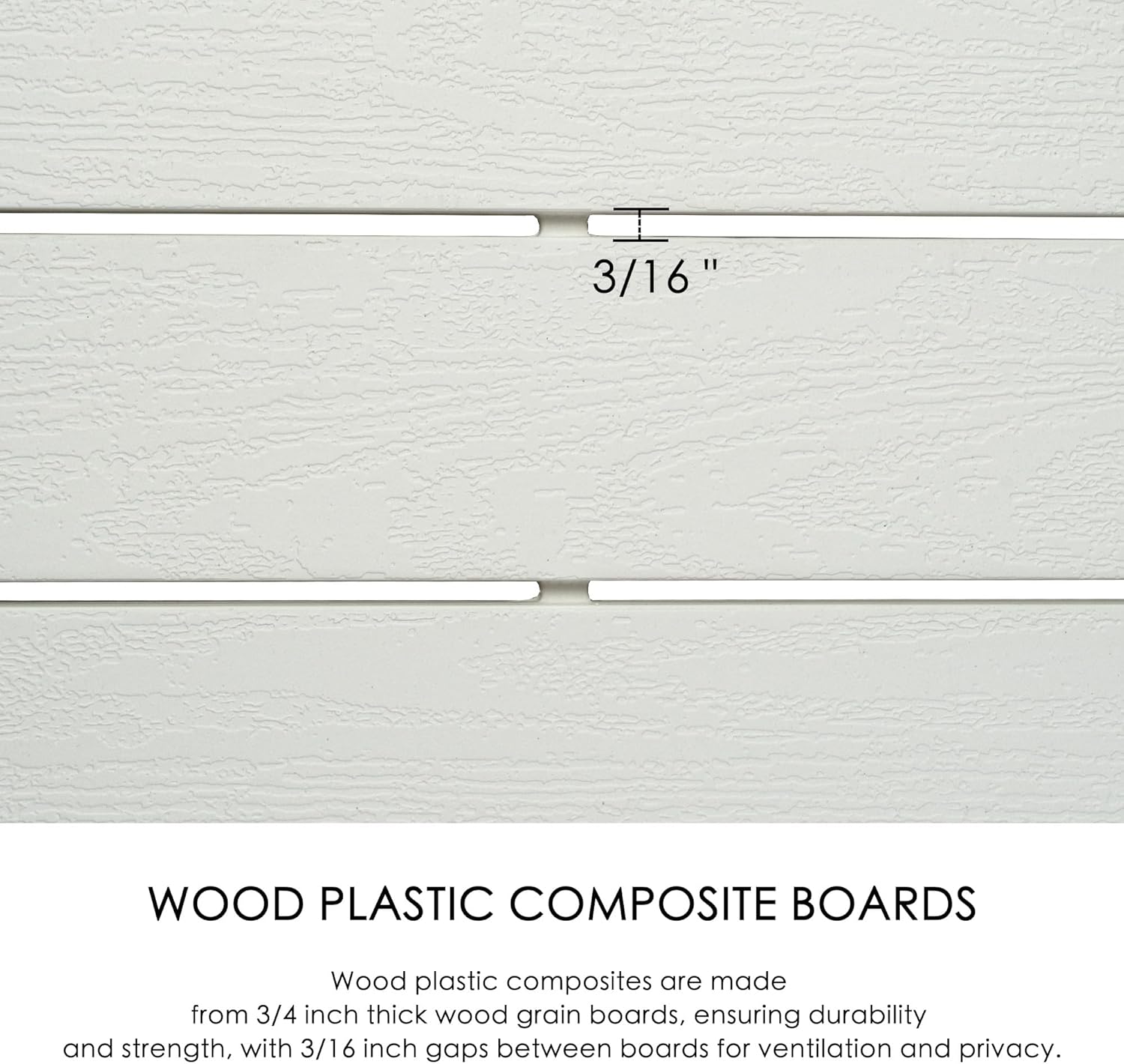 - High-Quality Material: Our outdoor privacy screens are crafted from medium-density polyethylene, designed with a wood-like appearance that is more resistant to water and corrosion than cast iron. The 3/16-inch gaps between the boards provide ventilation while maintaining privacy. The smooth surface resists dust and stains, and the simple white color complements any setting.