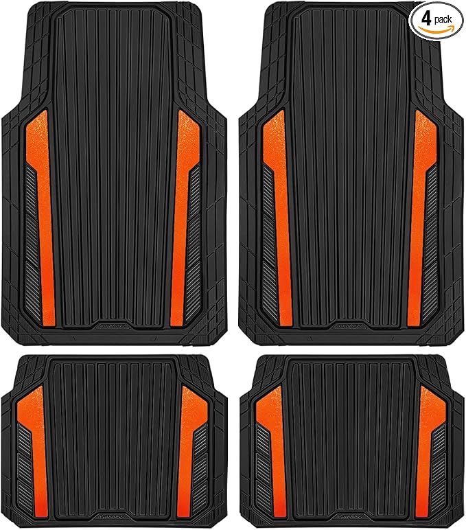 CAR PASS Heavy Duty Rubber Car Mats Metallic, Aluminum Film All Weather Floor Mats Waterproof Universal Trim to Fit SUVs Sedans Vans 4 Piece Anodized Deep Dish Two-Tone Sporty Black Orange Chrome