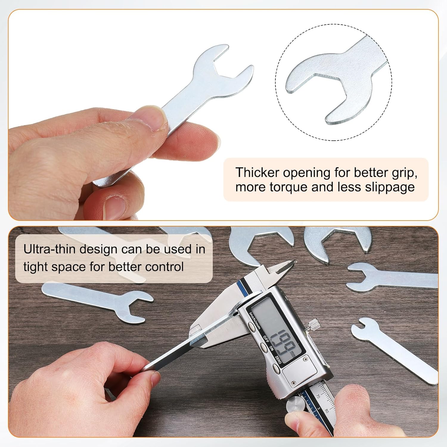 - Size - Open end: 13mm / 0.51"; Open outside width: 25mm / 0.98"; Total length: 70mm / 2.76"; Stem thickness: 1.5mm / 0.06"; Stem width: 11.3mm / 0.45"; Color: Silver-grey; Package includes: 10 x Single open-end wrenches. The open wrench set is thin enough to work on tight spots.