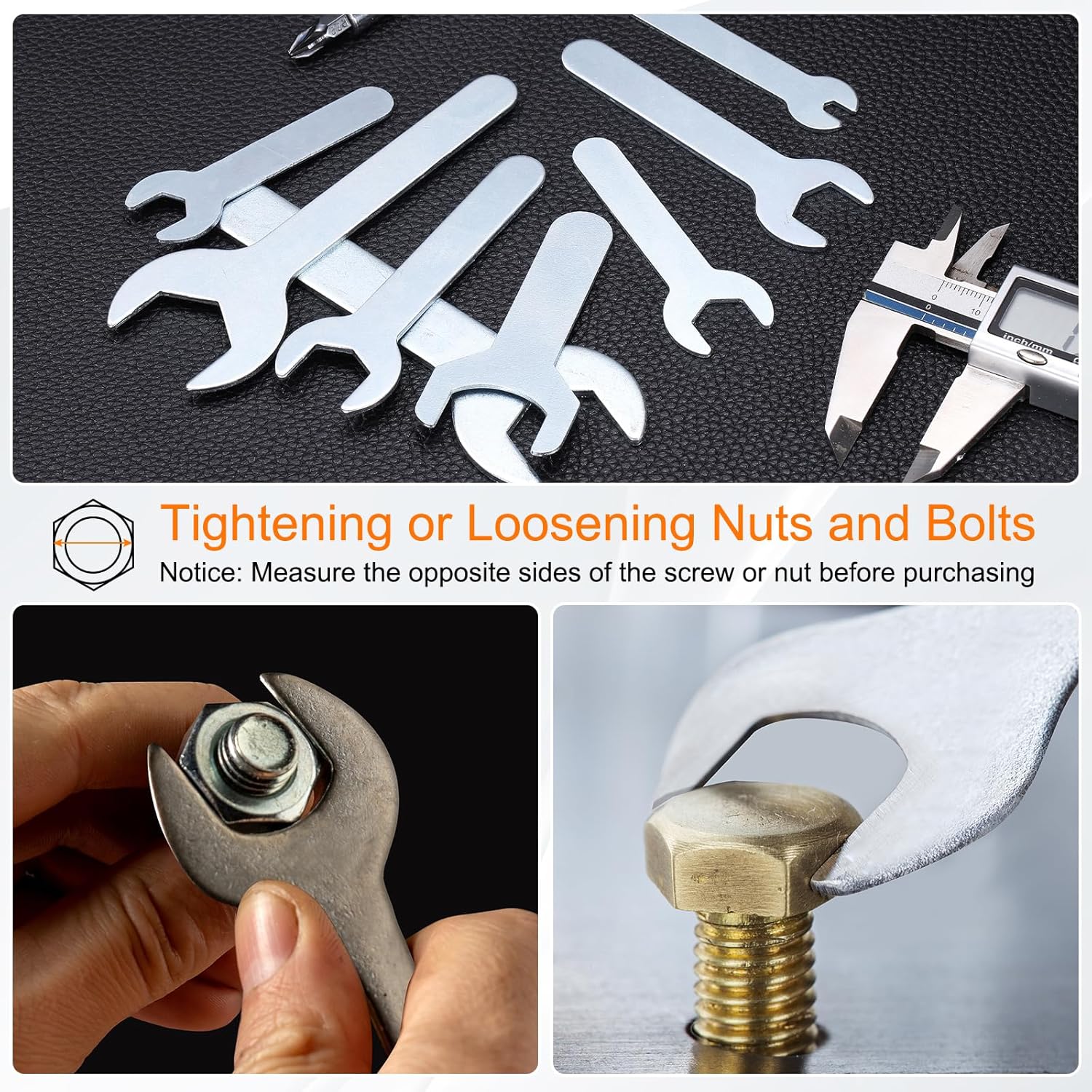 - Note - Please use a caliper to measure the opposite sides of the screw and nut before purchasing, and then choose the corresponding open-end wrench. Always use the correct size wrench to avoid rounding the bolt head or damaging the wrench.