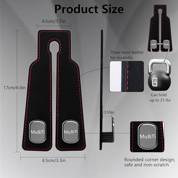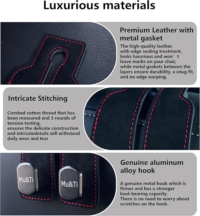 - Tesla-Style Craftsmanship: The Car Seat Headrest Hook is made from high-quality aluminum alloy and premium leather. The aluminum alloy hook is crafted using the same advanced technology as Tesla, ensuring superior strength and durability. The leather, made from three layers, offers a comfortable feel while being highly wear-resistant, making the hook both stylish and long-lasting.