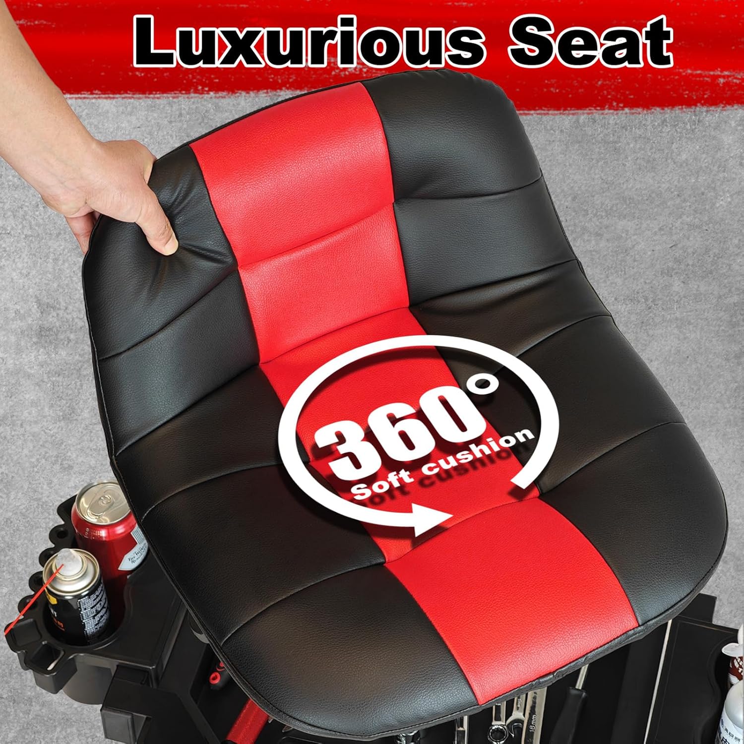 Rolling Stool with Wheels, Adjustable Height Pneumatic Garage Work Mechanic Stool Seat with Backrest, 400 LBS Capacity 360° Swivel Mechanic Crepper Chair with Tool Tray Storage, Red