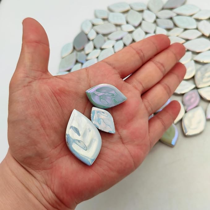1.1LB Iridescent Leaves Ceramics Mosaic Tiles,Making Creative 3 Size Ceramic Mosaic Pieces for DIY Craft,Flowerpots,Vases,Cups,Garden Decor Mosaic Making Supplies (Iridescent White)