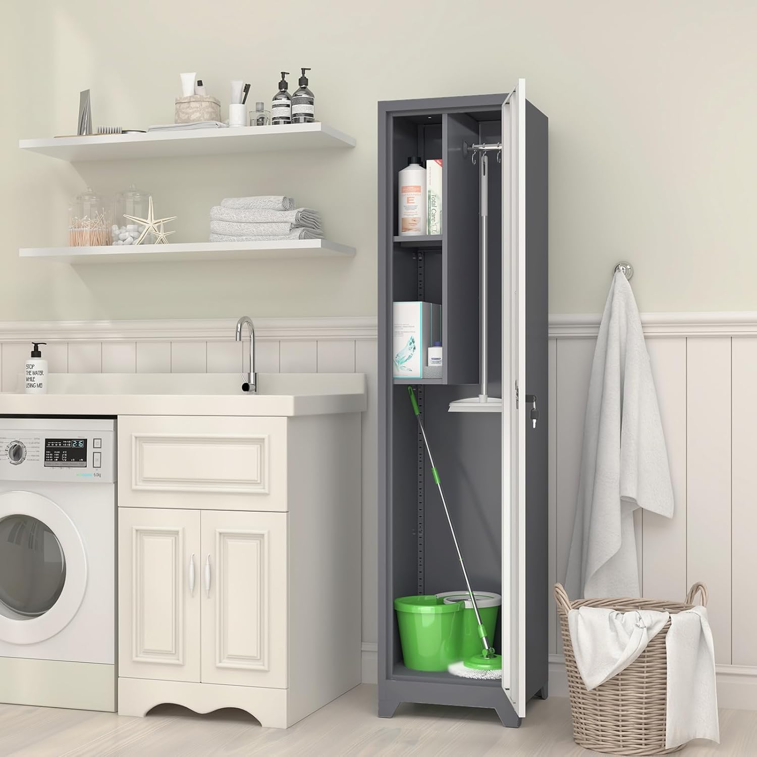 - 【Durable Construction】This metal cleaning storage cabinet made of powder-coated. With the storage cabinet for brooms and mops, you can easily organize and access your items while keeping them protected from dust and dirt.