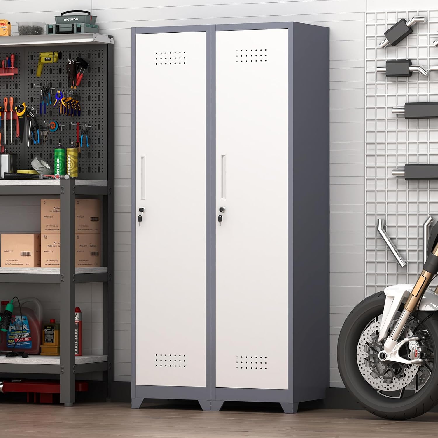 GREATMEET Slim Lockable Garage Storage Cabinet, Narrow Broom Storage Closet, 65" Metal Cleaning Tool Cabinet with Lock and Door,Utility Cabinets for Brooms and Mops for Laundry Room, White&Grey