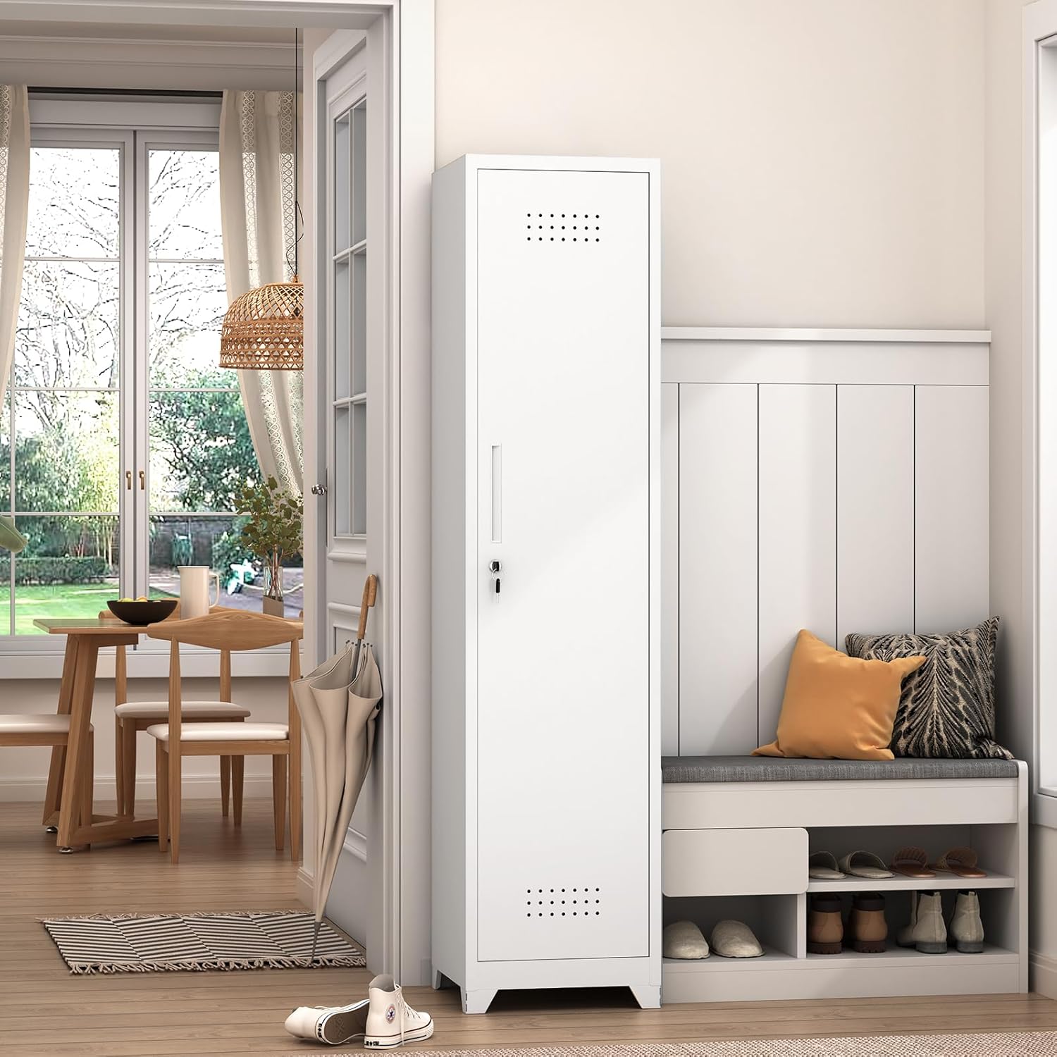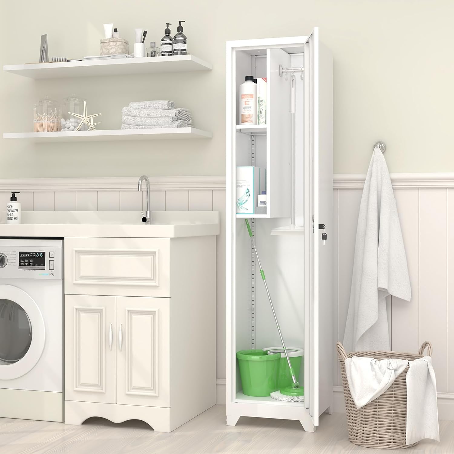 GREATMEET Slim Broom Closet Storage Cabinet, Narrow Utility Closet, 65" Metal Cleaning Supply Storage with Lock and Door,Utility Cabinets for Brooms and Mops for Laundry Room, White