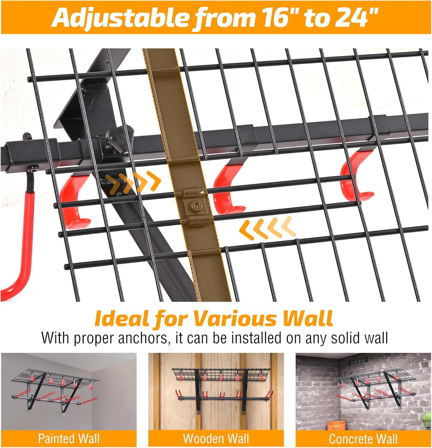 - 【Adjustable Spacing Design】 The spacing between the 2 triangular supports is adjustable from 16'' to 24''. This versatile design fits standard wall stud spacing (16”, 18”, 24” or others), ensuring easy installation in most garages.