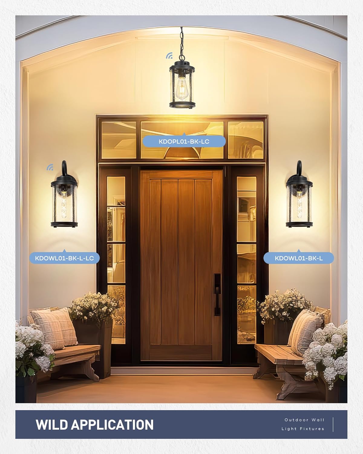 kudos Porch Lights Outdoor, 15.8 inch Large Cylinder Wall Light, E26 Sockets, Anti-Rust Waterproof Light Fixtures Wall Mount for Patio, Black with Seeded Glass, KDOWL01-BK-L
