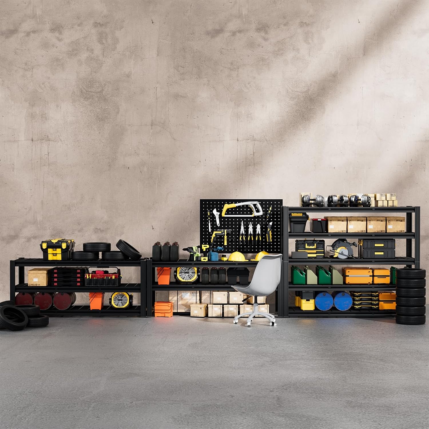 - 5-Tier Heavy Duty Shelves: Our garage shelving is crafted from cold-rolled steel plates and reinforced with sturdy double-layered metal pillars, with two support rods beneath each shelf for extra strength. This durable design ensures that the shelving units won't collapse or sag under heavy loads and can hold up to 3,000 pounds, offering a reliable and safe storage solution.
