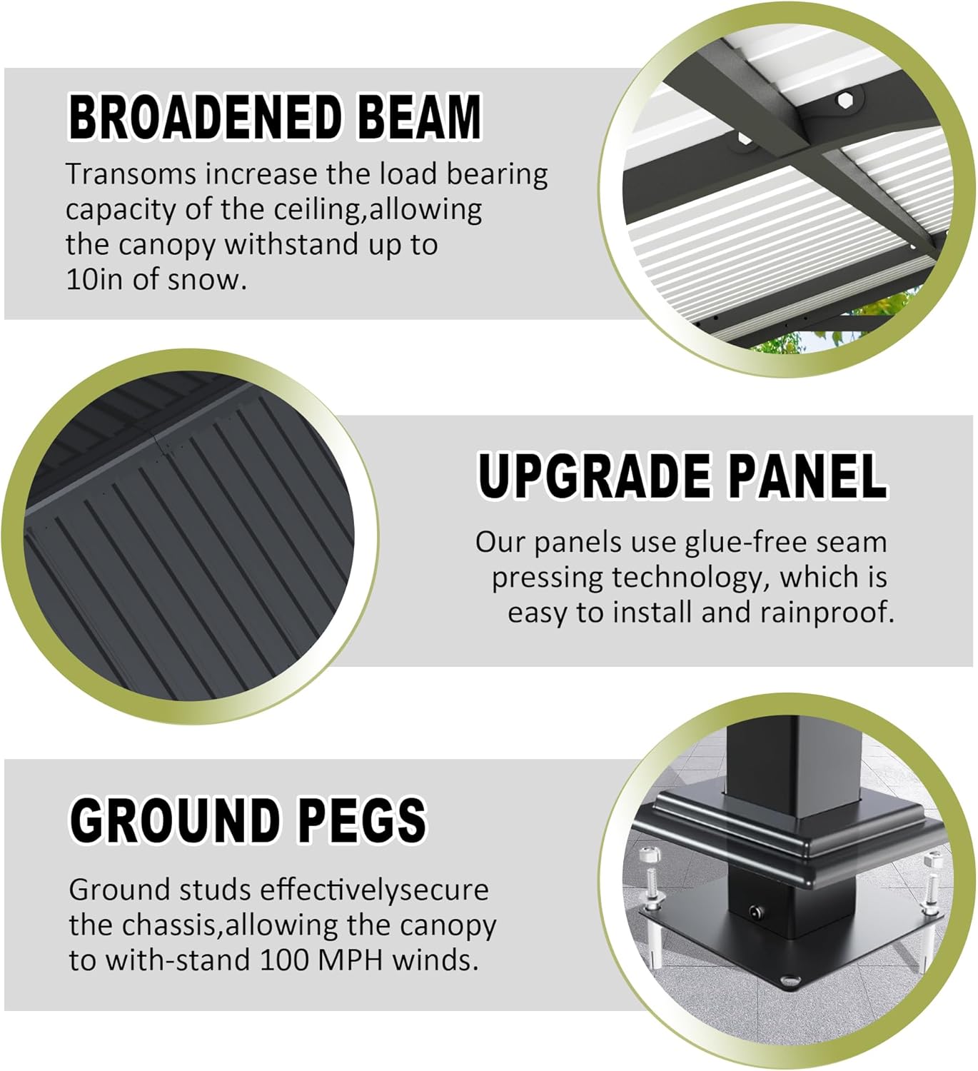 - 【UPGRADED RAINPROOF CANOPY】Different from the carports on the market,our canopy adopts a vertical stripe design, which is more conducive to the drainage of rainwater, canopy is installed with a press seam design to prevent rain leakage.
