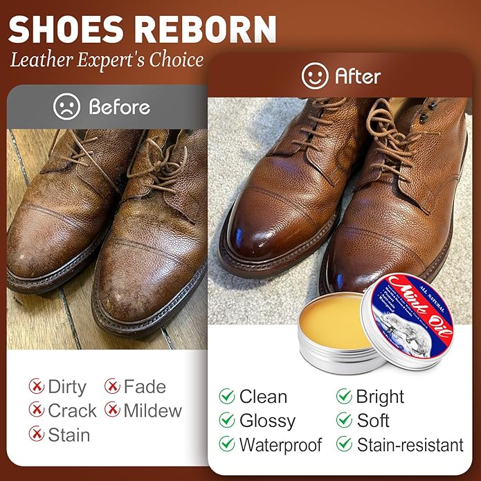 - 【Waterproof and Anti-Stain】:Upgraded mink oil made of all natural component,no organic silicon.The leather shoe cleaner can make leather polishing, care and protection. making it soft, elastic, and glossy, After using the mink oil for leather boots, it can make your leather goods waterproof and stain resistant, prevent cracking and fading. Whether you use it on new or old leather care,its long-lasting effect makes it indispensable.