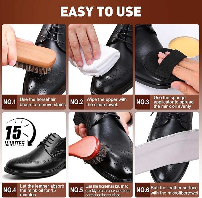 - 【7PCS Leather Boot Care Kit】:This mink oil set includes 3.52 oz-all-natural waterproof mink oil,horsehair brush,bristle brush,2PCS sponges,microfiber shoe cloth and towel.These leather boot care tools can meet all your needs for comprehensive and in-depth leather care.