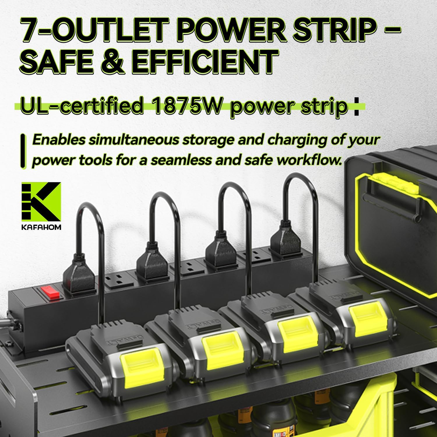 KAFAHOM Power Tool Organizer with Charging Station,9 Drill Holder Wall Mount,4 Layer Durable Metal Cordless Drill Storage for Garage Organization,Battery Tool Rack Built in 7 Outlet Power Strip Black