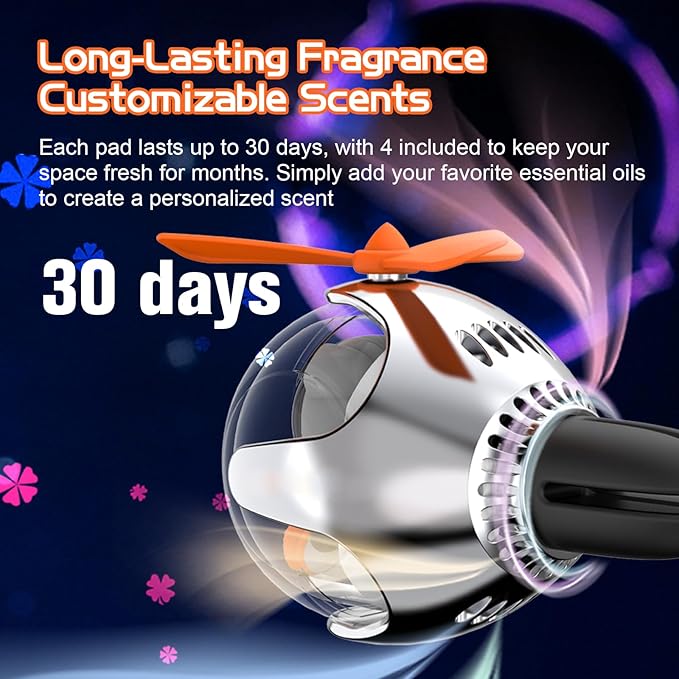 - [Gentle Fragrance & Easy Customization] -- Includes 4 premium scented pads with a light, non-overpowering aroma. Easily swap scents to match your mood or season. Ideal for small spaces, the delicate fragrance ensures a comfortable driving experience without overwhelming sensitive passengers.