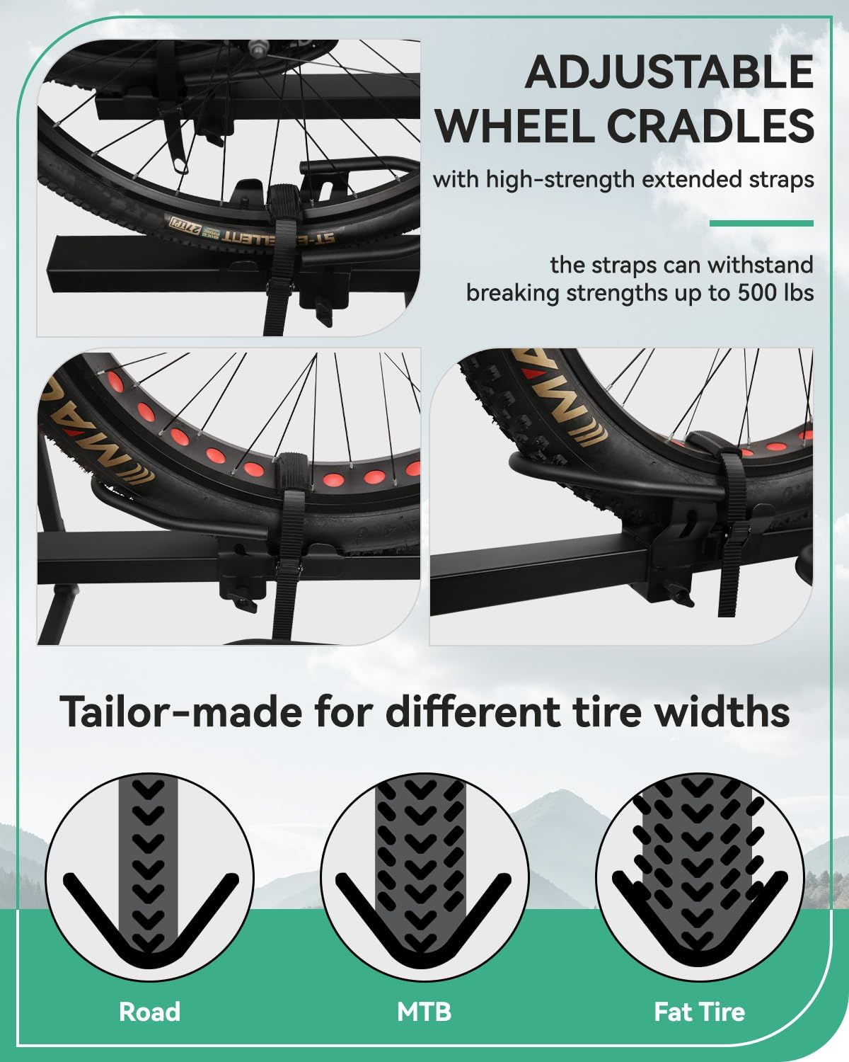 - Secure & Stability: This 2 bike rack comes with a thread-locking hitch pin and an anti-sway receiver insert for locking the hitch and preventing wobble. Adjustable wheel cradles with tire straps prevent wheels from spinning.