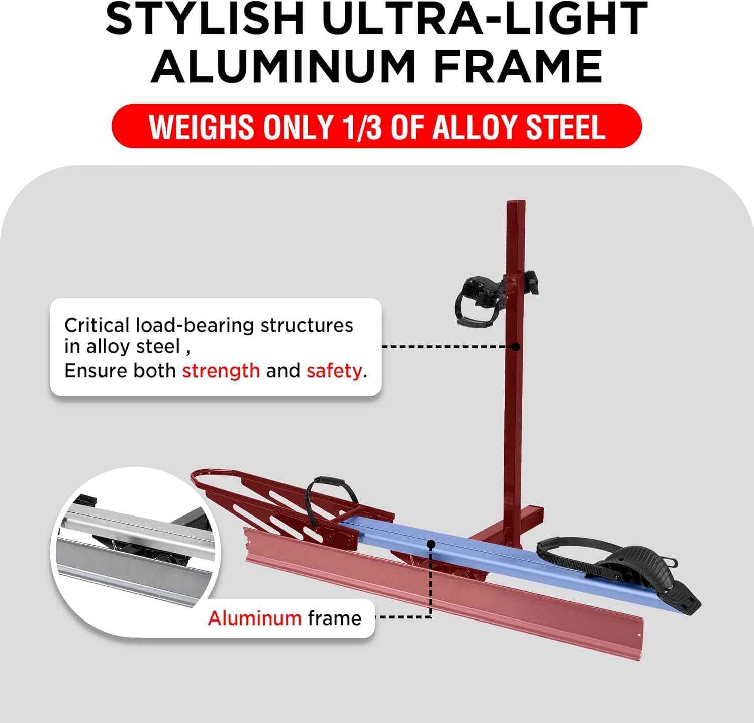 - LOADING RAMP INCLUDED: No need practicing weightlifting any more! Most of the ebikes are quite heavy, to be honest. It is not an easy thing to lift it onto the rack by oneself. The ramp and rack can be securely hooked together through a slot and buckle system. You can push the ebike onto it effortlessly.