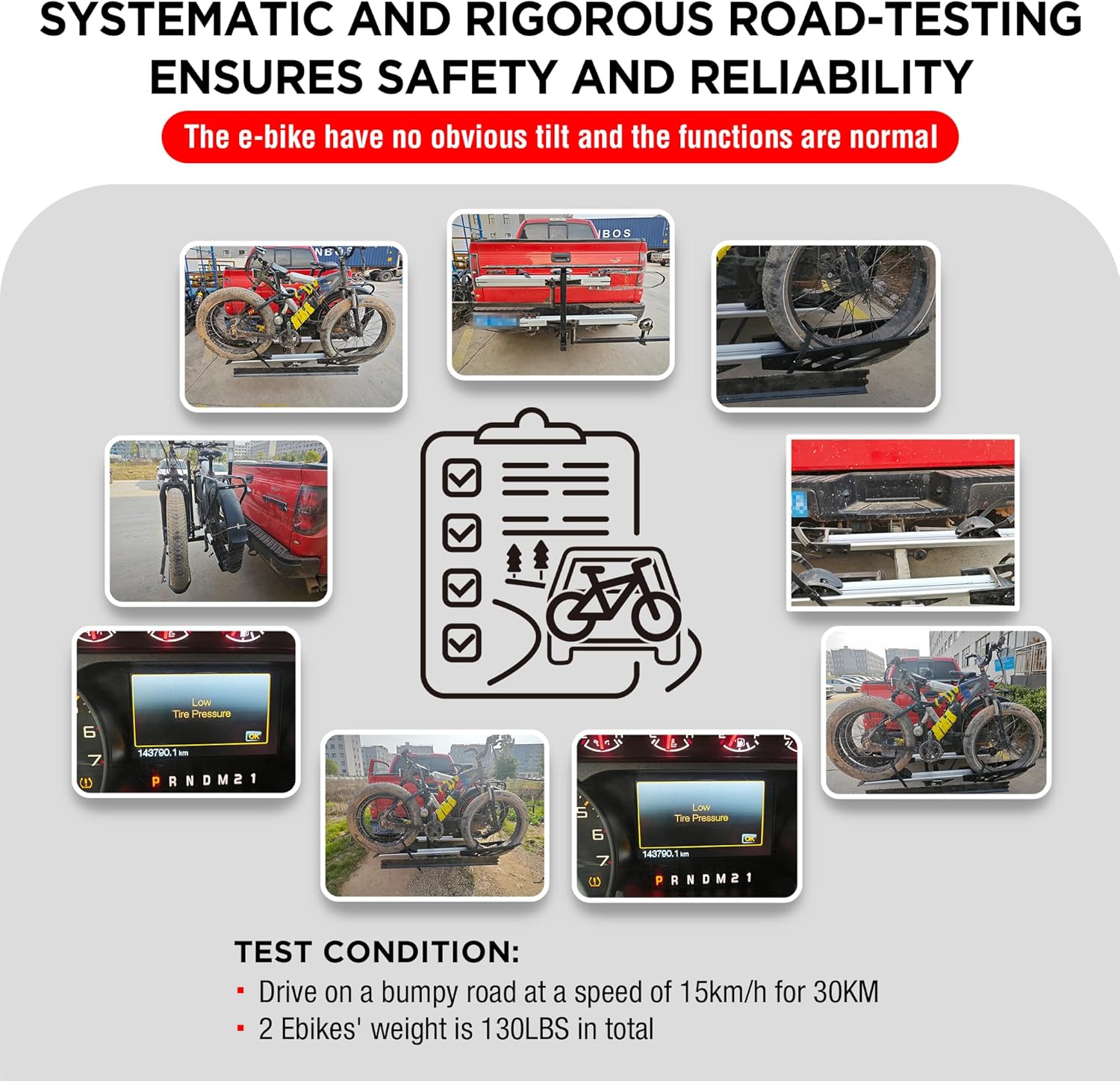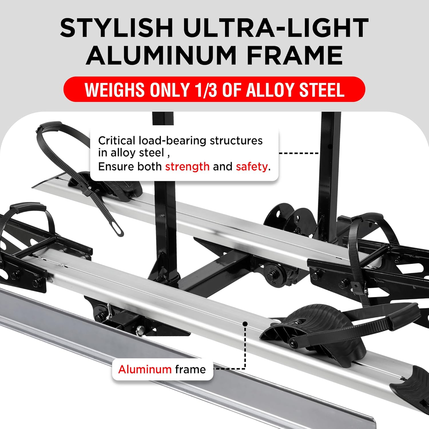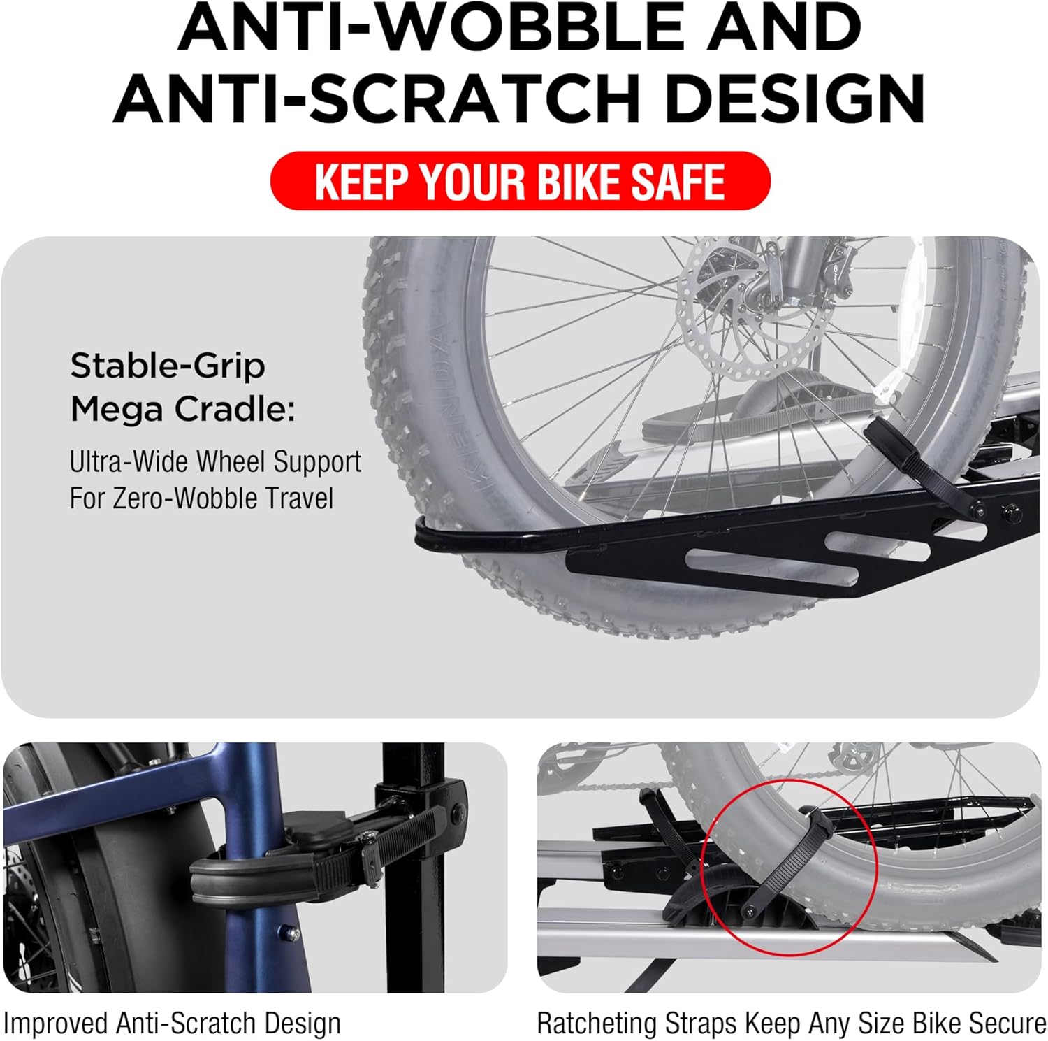 - NO-SCRATCH DESIGN: The rack is elaborately designed to prevent direct contact between the rack's metal surface and your e-bike, avoiding any potential scratch or damage. With ratcheting safety straps, soft padding and rubber covers, your e-bikes will be safely tightened onto the rack, facing the slightest wobbles even on the roughest roads.