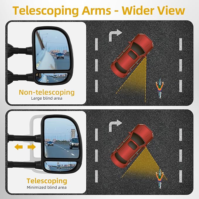 - Mirror Dimensions: Includes a pair of telescoping trailer tow mirrors for both driver and passenger sides. Side mirror length is 18.03” (closed) and 21.34” (extended); side mirror size is 13”×9”