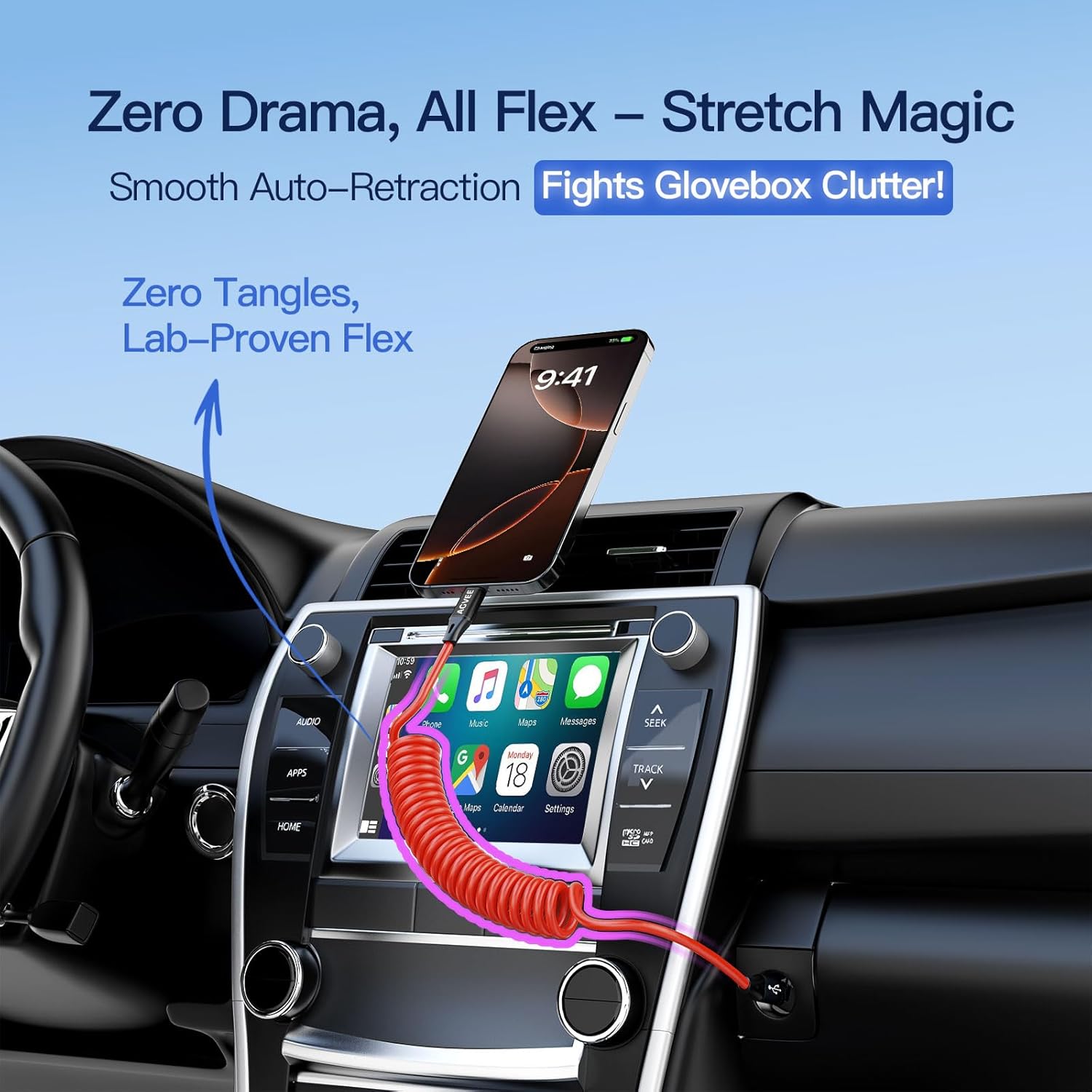 - ๐[Tame Your Car's Cable Jungle] No more wrestling with spaghetti cords! Our coiled design stretches from short to long, perfect for tight car spaces, then snaps back neatly like a slinky. Keep your cup holders free for coffee, not tangled chaos! Soft and elastic: No more wrestling with stiff, frozen-spaghetti-like cables in winter; Squishy as a pacifier, coils like a zen master.