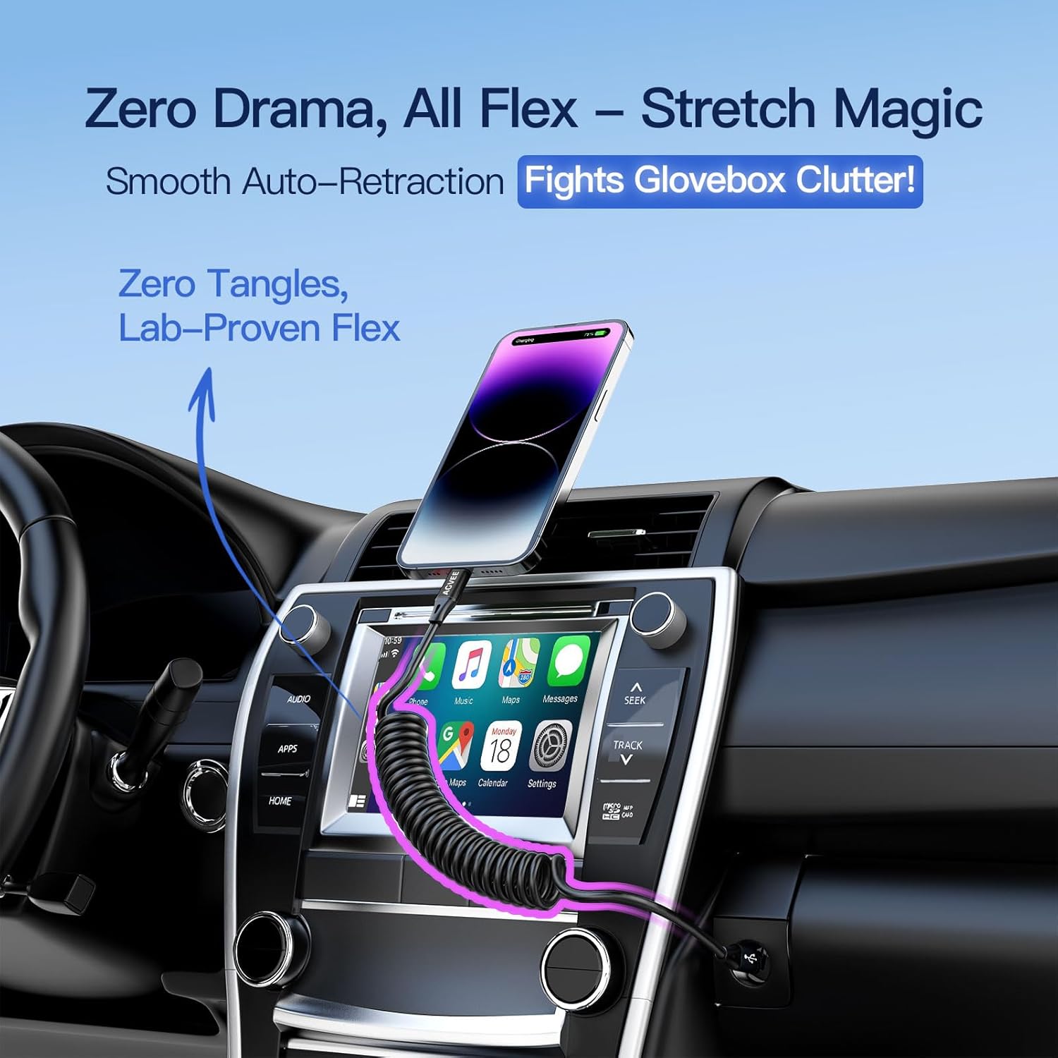- π[Tame Your Car's Cable Jungle] No more wrestling with spaghetti cords! Our coiled design stretches from short to long, perfect for tight car spaces, then snaps back neatly like a slinky. Keep your cup holders free for coffee, not tangled chaos! Soft and elastic: No more wrestling with stiff, frozen-spaghetti-like cables in winter; Squishy as a pacifier, coils like a zen master.