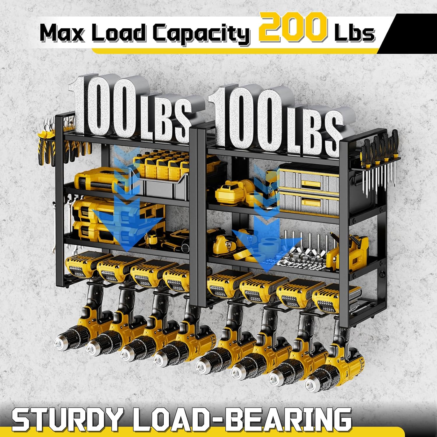 - Extra Large 8 Drill Holders and 4-Layer Capacity:This power tool organizer uses the latest four-tier high-capacity design. The bottom layer can store 8 cordless drills, the upper three layers can store other heavy tools or various small tools, and seven hooks, a hammer holder, pliers holder and screwdriver holder are added to the side