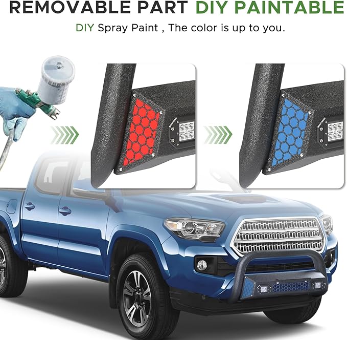- Enhance Off-road: The bull bar fit for Toyota Tacoma with LED light illuminate the darkest trails, making night adventures a breeze. Off-road brush push bar includes a license plate bracket, keeping your plate firmly in place on rough terrains. The trim panel of the off-road bull bar can be free-painted, the color is up to you