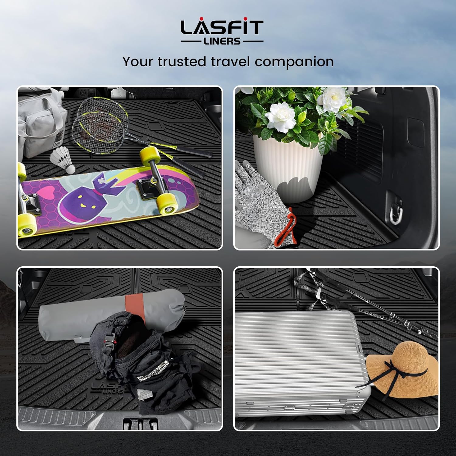 - ăFull-Coverage ProtectionăLASFIT floor mats carefully consider coverage during the real car data scanning process to ensure all-around protection for your vehicle. Whether your third-row seats are folded or upright, the mats precisely cover every corner of the trunk and seatback , including contours, seatback areas, and seams