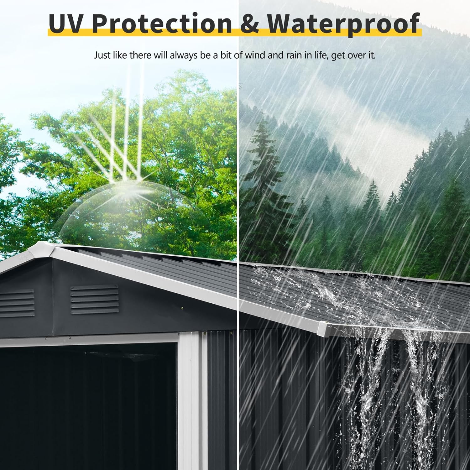 - š”šš„š„-š°šššš”šš« šššØš«šš š šš”šš: Our metal shed 8x10 features sliding doors that open and close smoothly, with handles and a heavy-duty lock for added security. It serves not only as a safe space for storing garden tools but also as a warm pet house. The sloped roof of the storage building effectively prevents leaks and snow accumulation, while the four integrated punched vents improve airflow, helping to keep your items dry.